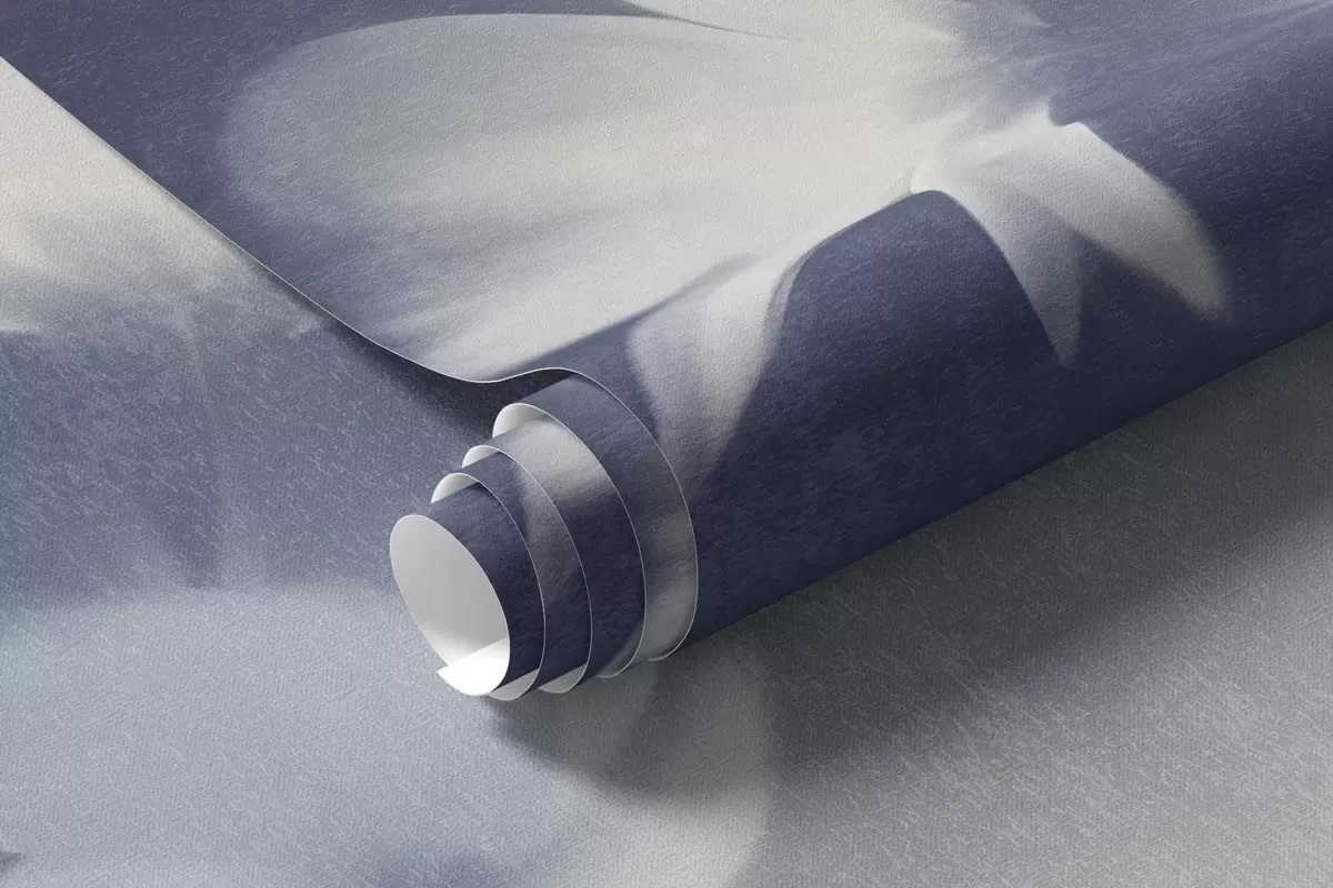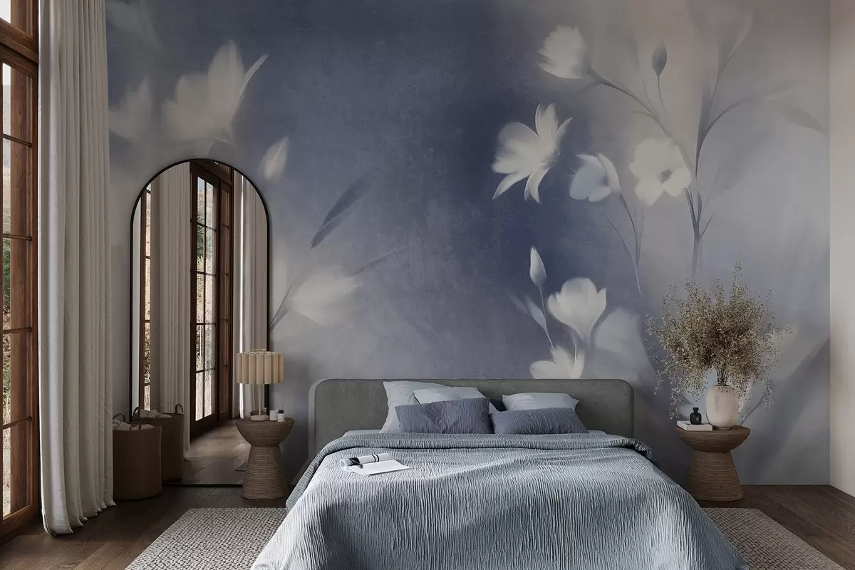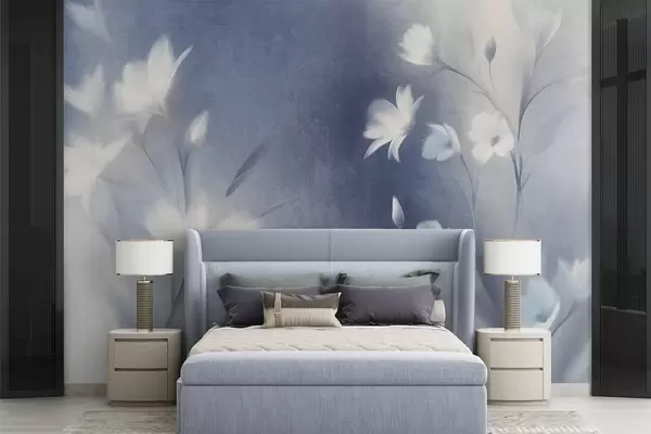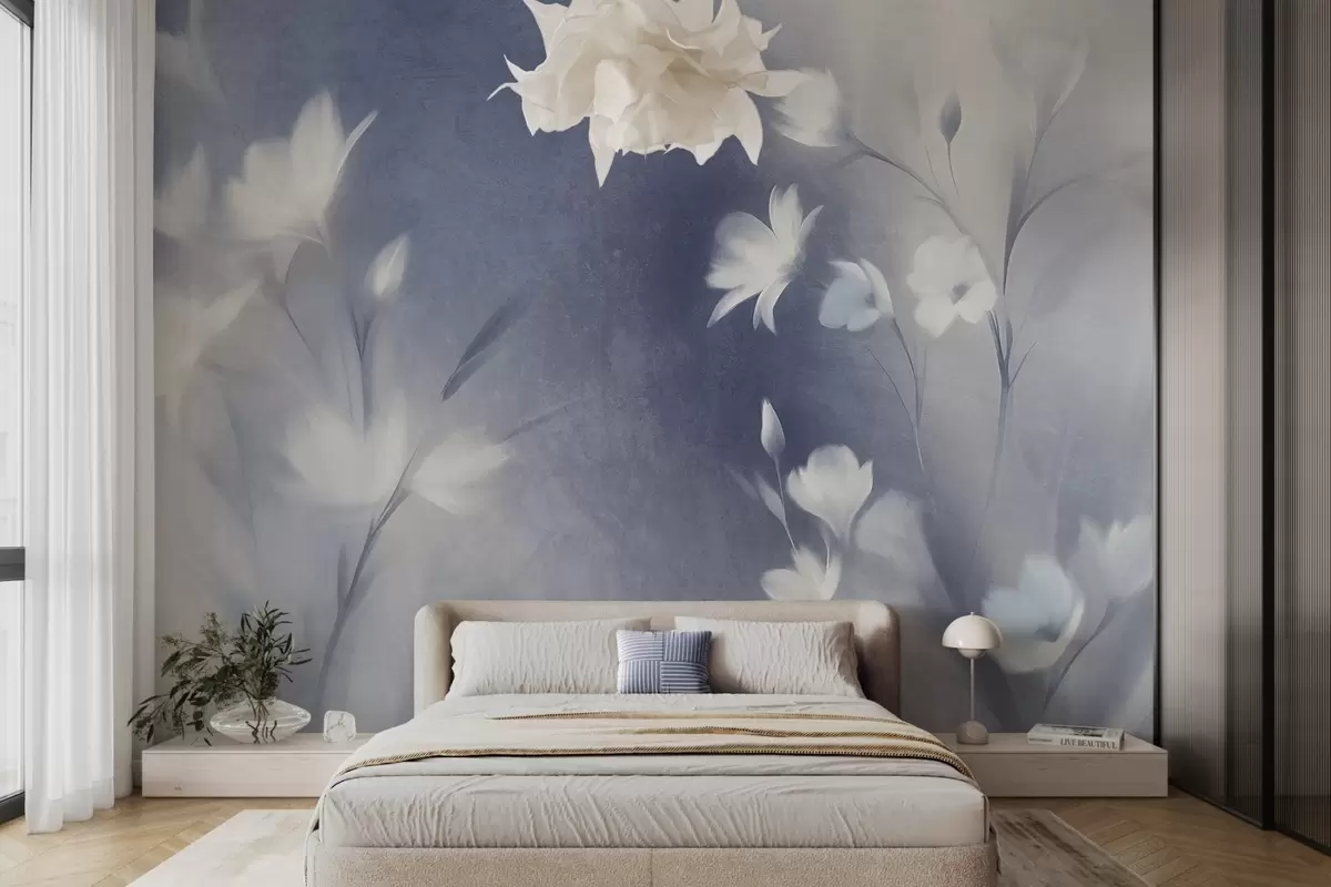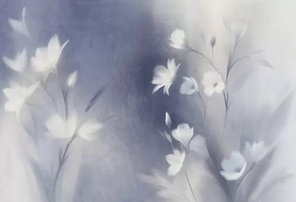 Fototapeedid Valged tekstuuriga lilled pikkade vartega, pehmed pungad sinise ja valge toonide ähmase taustaga Nr w09484