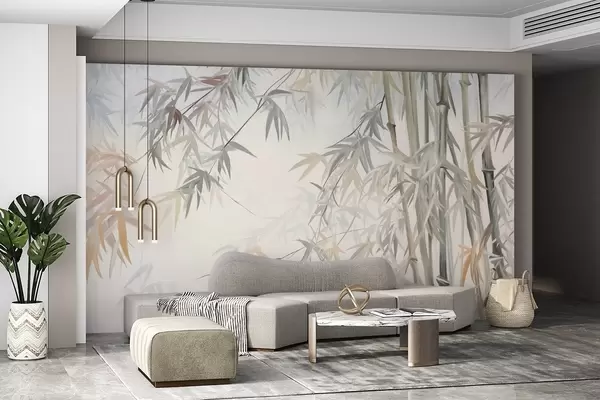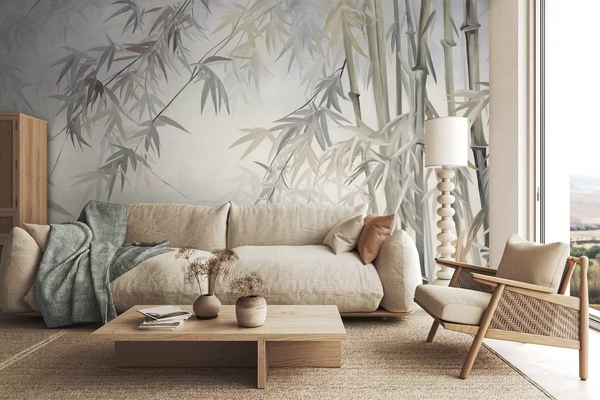 Fototapeedid Tekstuuriga bambusevarred ja lehed pehmes, vaoshoitud halli, valge ja kreemika värvipalettis, minimalistlik kompositsioon Nr w09485