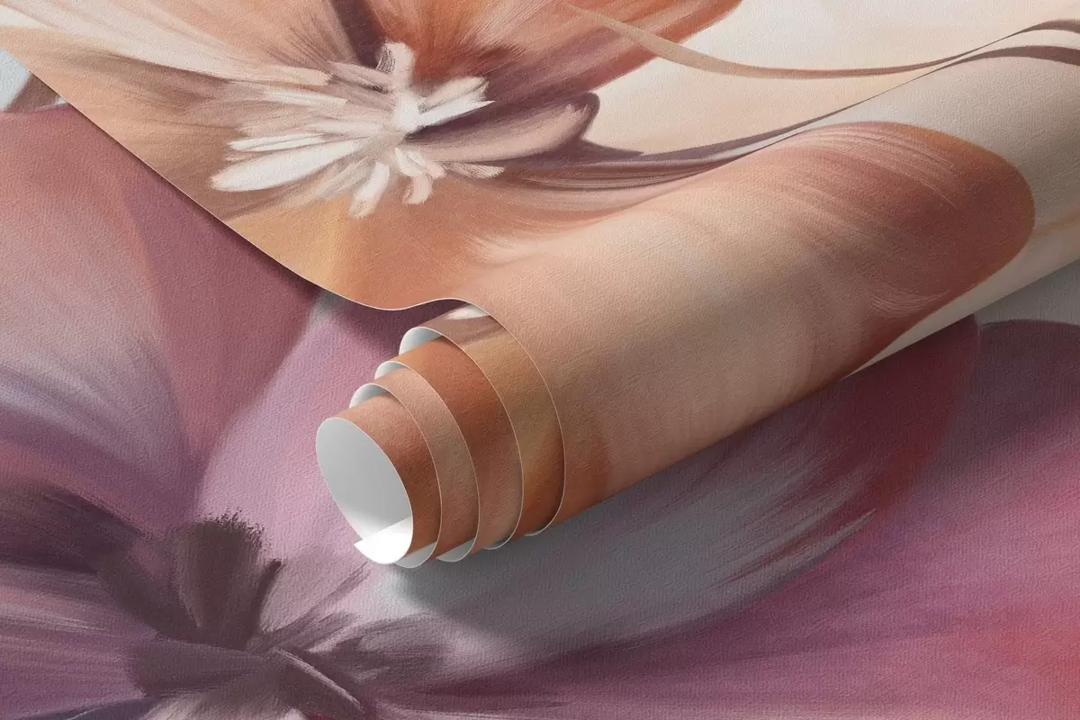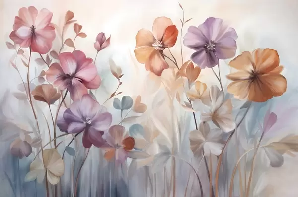 Fototapeedid Tekstuurne lillekompositsioon roosa, lilla ja oranži värvi lilledega, roheliste varte ja lehtedega, pehmed pastelltoonid Nr w09486