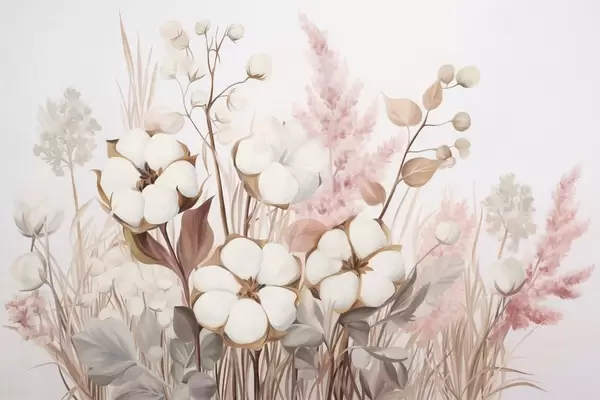 Fototapeedid Puuvillane tekstuuriga lilled valge ja roosa pampasrohu, beeži ja pruuni lehtede ja ürtidega, valge taustaga Nr w09489