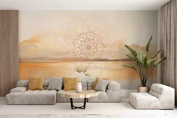 Fototapeedid Tekstuuriga sümmeetriline mandala disain, mis katab maastiku mere, mägedega ja taevaga, pehmed pastellvärvid Nr w09491