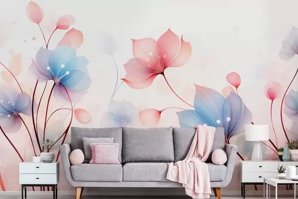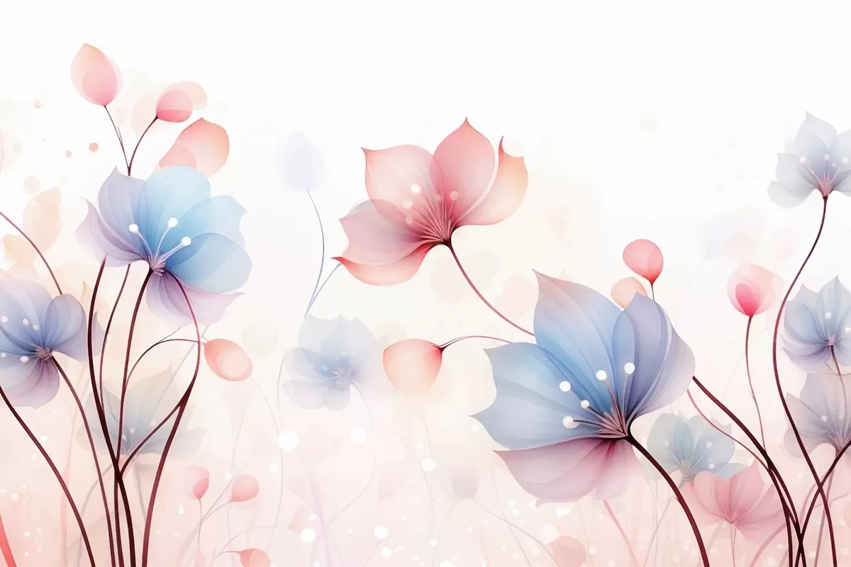 Fototapeedid Õrnad roosa-sinised lilled — õhuline taimestik valgel akvarelltaustal Nr w09507