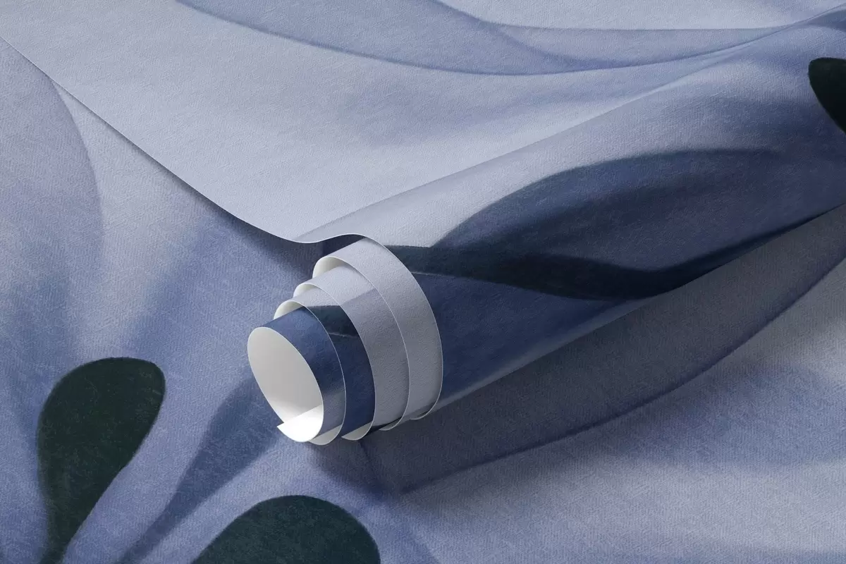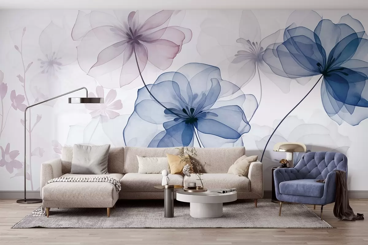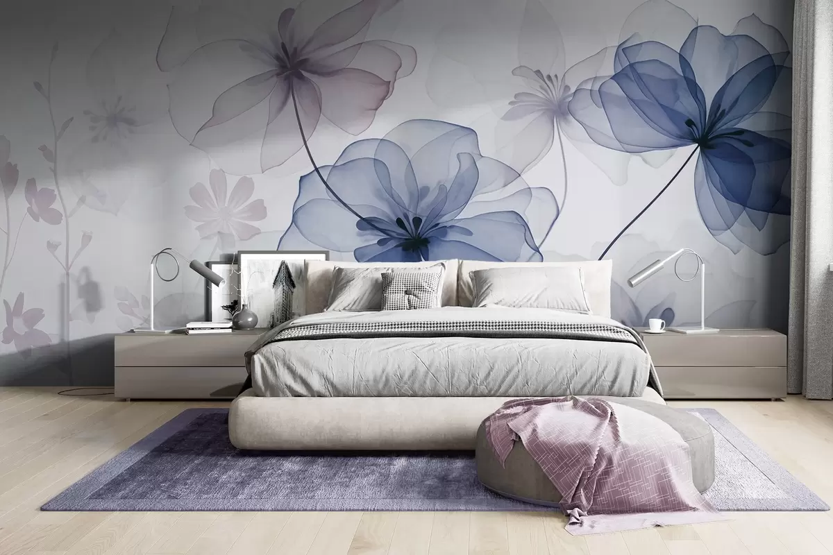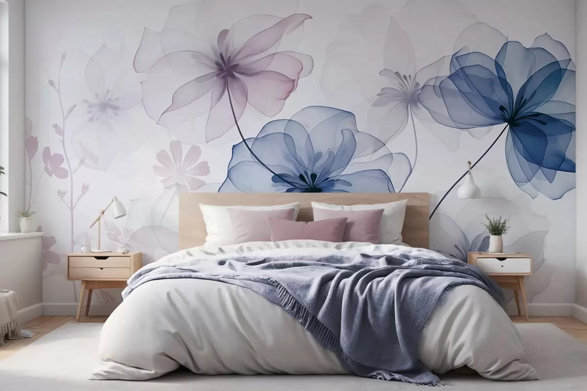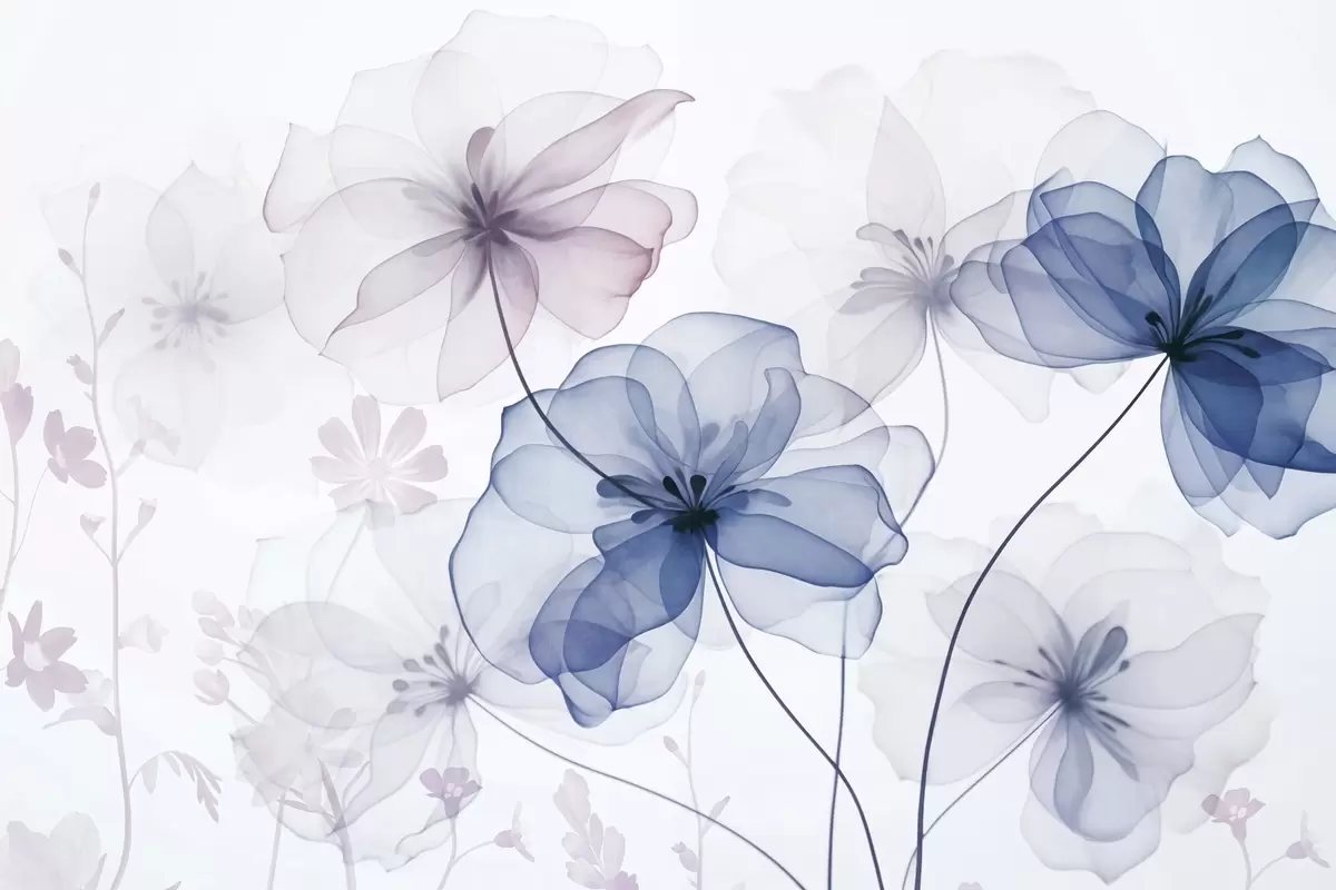 Fototapeedid Läbipaistvad lilled, millel on tuhmid sinised ja roosad õielehed, pikad varred, hele taust, pehmed värvid, tekstuuriga lillemustriga disain Nr w09529v1