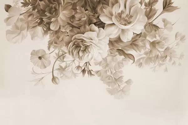 Fototapeedid Vintage-stiilis lillekompositsioon rooside, pioonide ja muude tekstuuriga lillede ning lehtedega heledal taustal Nr w09532