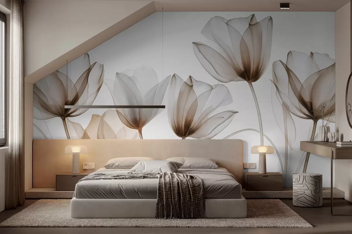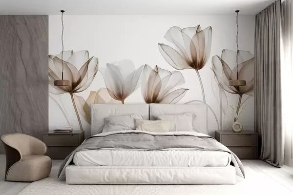 Fototapeedid Läbipaistvad pruunid ja valged tulbid pikkade vartega, heleda taustaga, delikaatne ja tekstuurne lillekunst Nr w09538v1