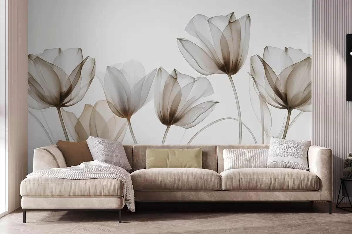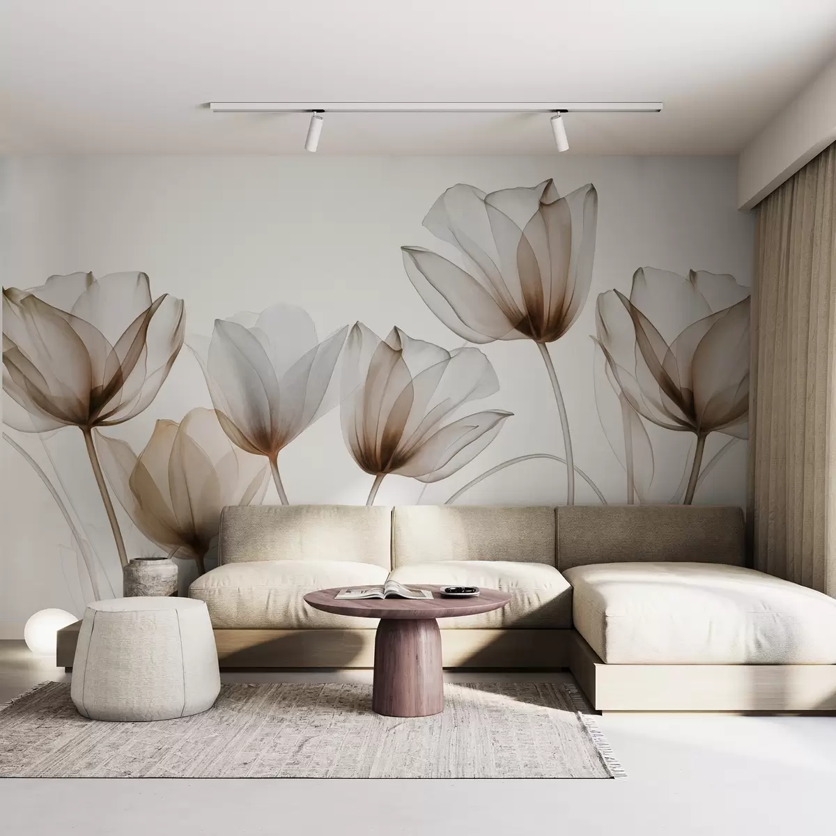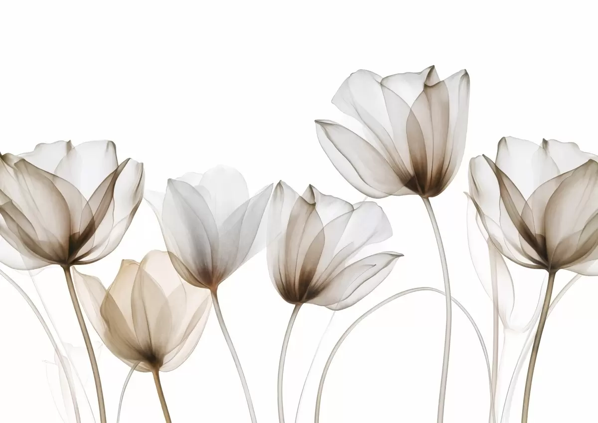Fototapeedid Läbipaistvad pruunid ja valged tulbid pikkade vartega, heleda taustaga, delikaatne ja tekstuurne lillekunst Nr w09538v1