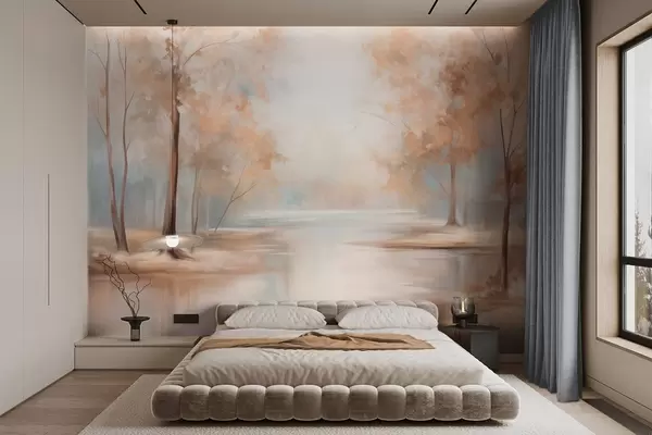 Fototapeedid Sügisene tekstuuriga maastik puude ja jõega, pehmed värvid, kerge ja õhuline atmosfäär, rahulik ja vaikne stseen Nr w09541