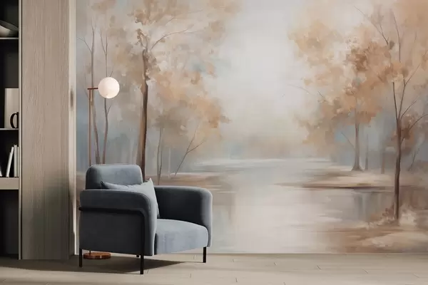 Fototapeedid Sügisene tekstuuriga maastik puude ja jõega, pehmed värvid, kerge ja õhuline atmosfäär, rahulik ja vaikne stseen Nr w09541