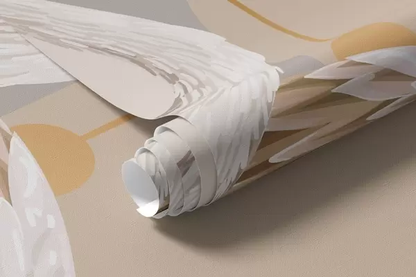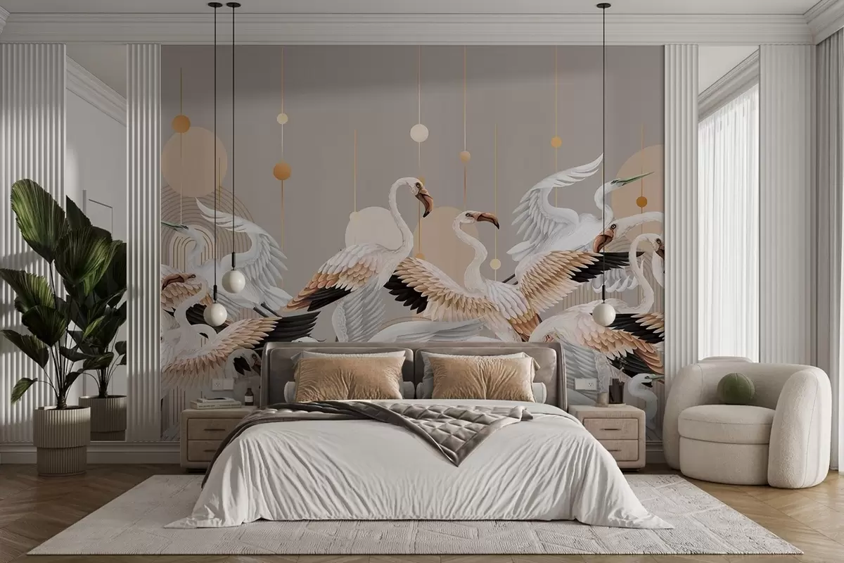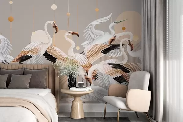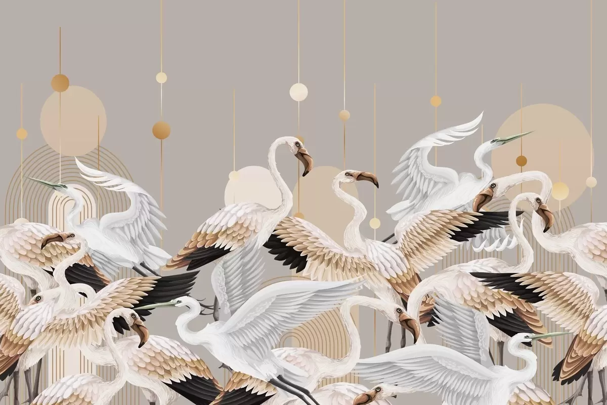 Fototapeedid Valge flamingode parv õrnad tiibadega neutraalsel taustal kollaste joonte ja ringidega Nr w09546v1
