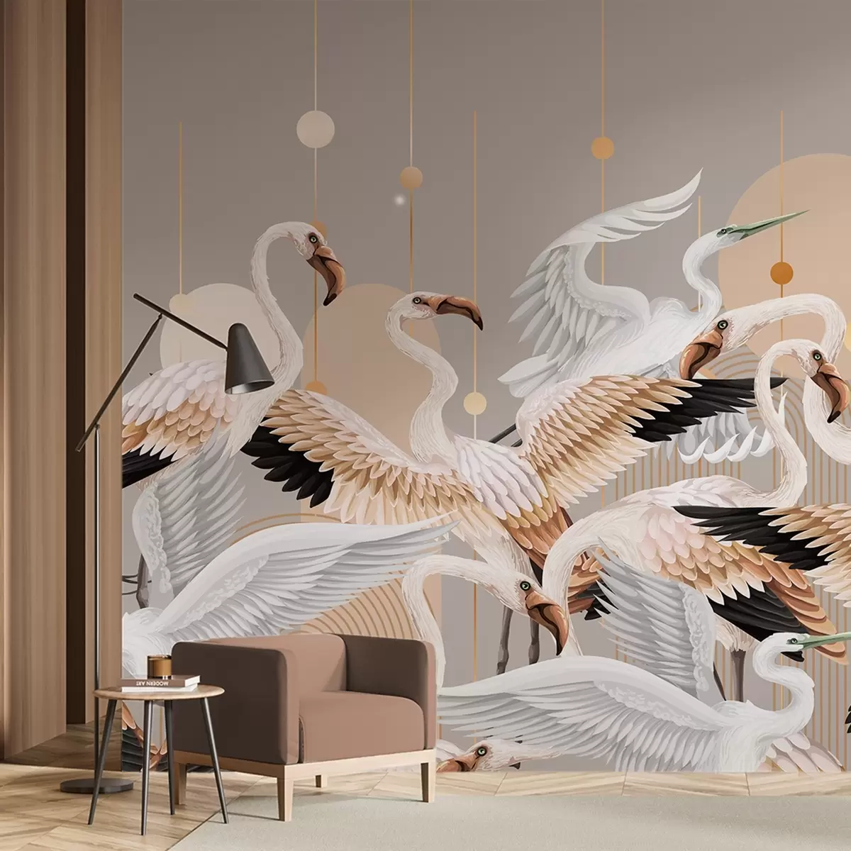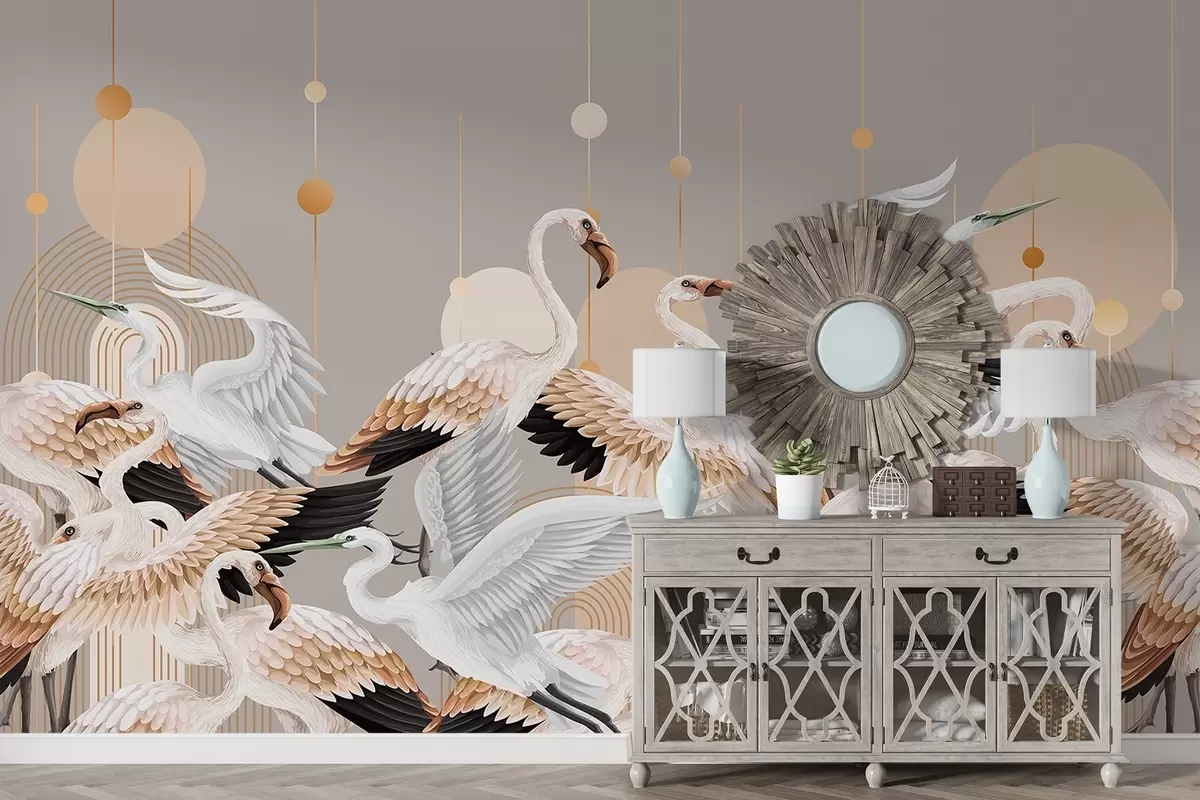 Fototapeedid Valge flamingode parv õrnad tiibadega neutraalsel taustal kollaste joonte ja ringidega Nr w09546v1