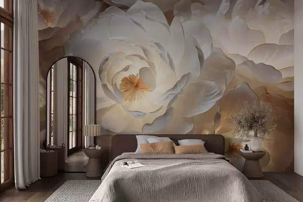 Fototapeedid Suured, valged fantaasiarikkad pioonid kollase südamikuga, pehme valgustuse ja õrna tekstuuriga kihiliste kroonlehtedega. Nr w09550