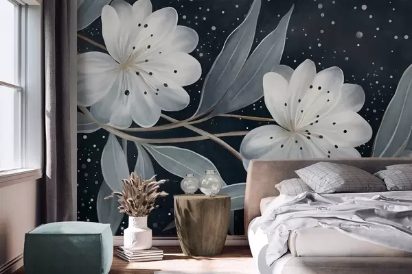 Fototapeedid Fantaasiatekstuuriga valged lilled, ümbritsetud sinakasrohelistest lehtedest ja okstest tumedal taustal Nr w09551