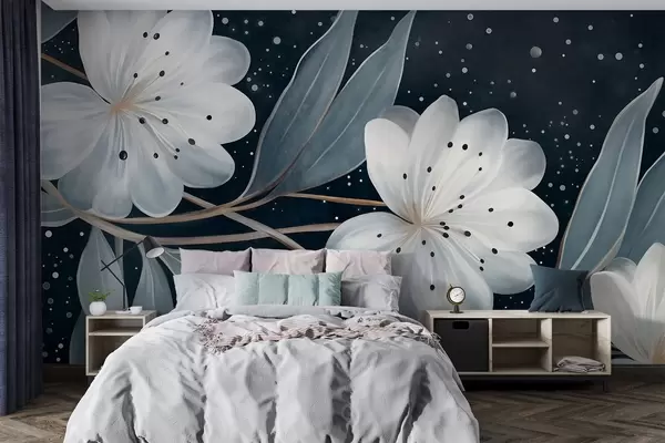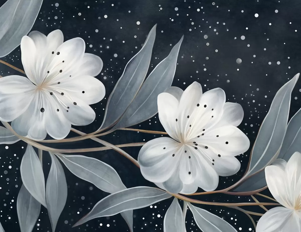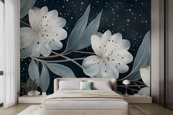 Fototapeedid Fantaasiatekstuuriga valged lilled, ümbritsetud sinakasrohelistest lehtedest ja okstest tumedal taustal Nr w09551