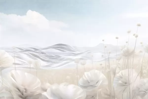 Fototapeedid Tekstuuriga kreemikas moonide väli, künklike mägedega helesinise taeva all, pehmetes pilvedes, pastelltoonides Nr w09553