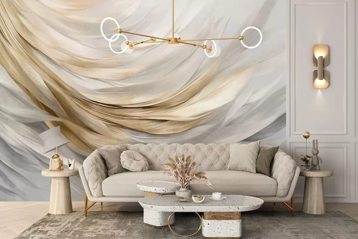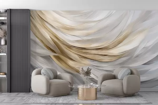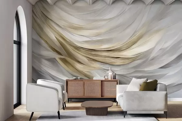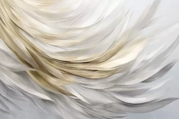 Fototapeedid Abstraktsed tekstuuriga valged, hallid ja kollased suled, mis loovad kerge taustaga voolava, kihilise mustri. Nr w09557