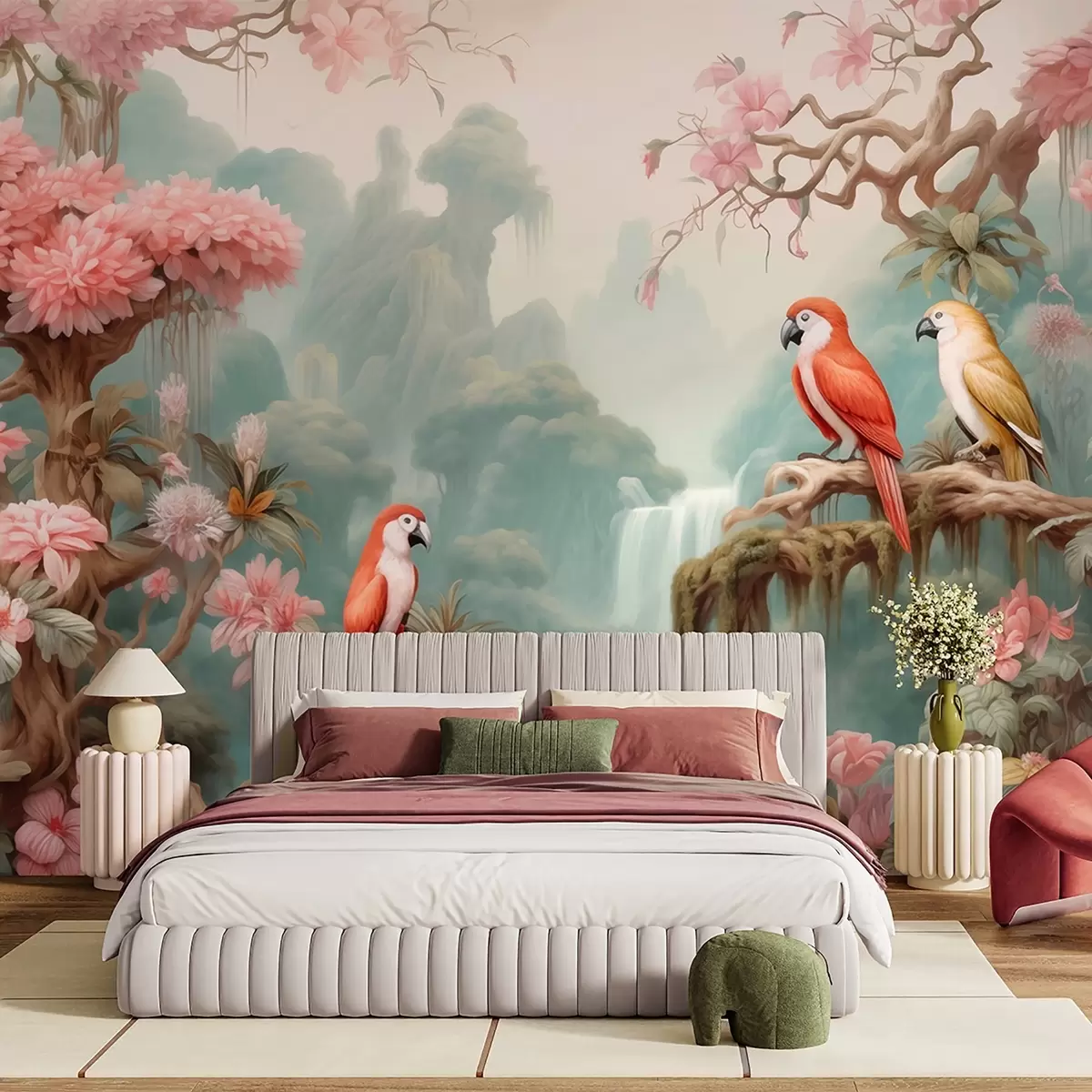 Fototapeedid Muinasjutuline troopiline mets papagoide, roosade õitega puude ja kosega Nr w09580