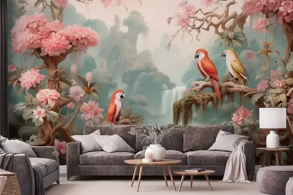Fototapeedid Muinasjutuline troopiline mets papagoide, roosade õitega puude ja kosega Nr w09580