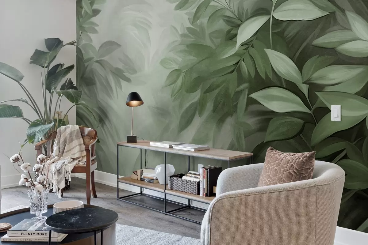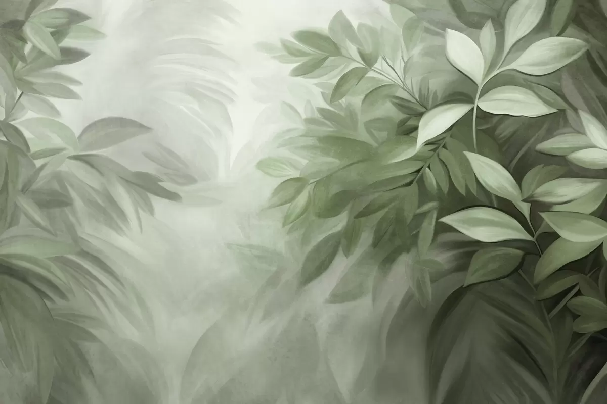 Fototapeedid Rohelised ja hallid lehed pehme, ähmase tekstuuriga lehistuga, maalilises stiilis nähtavate pintslitõmmetega Nr w09584v1