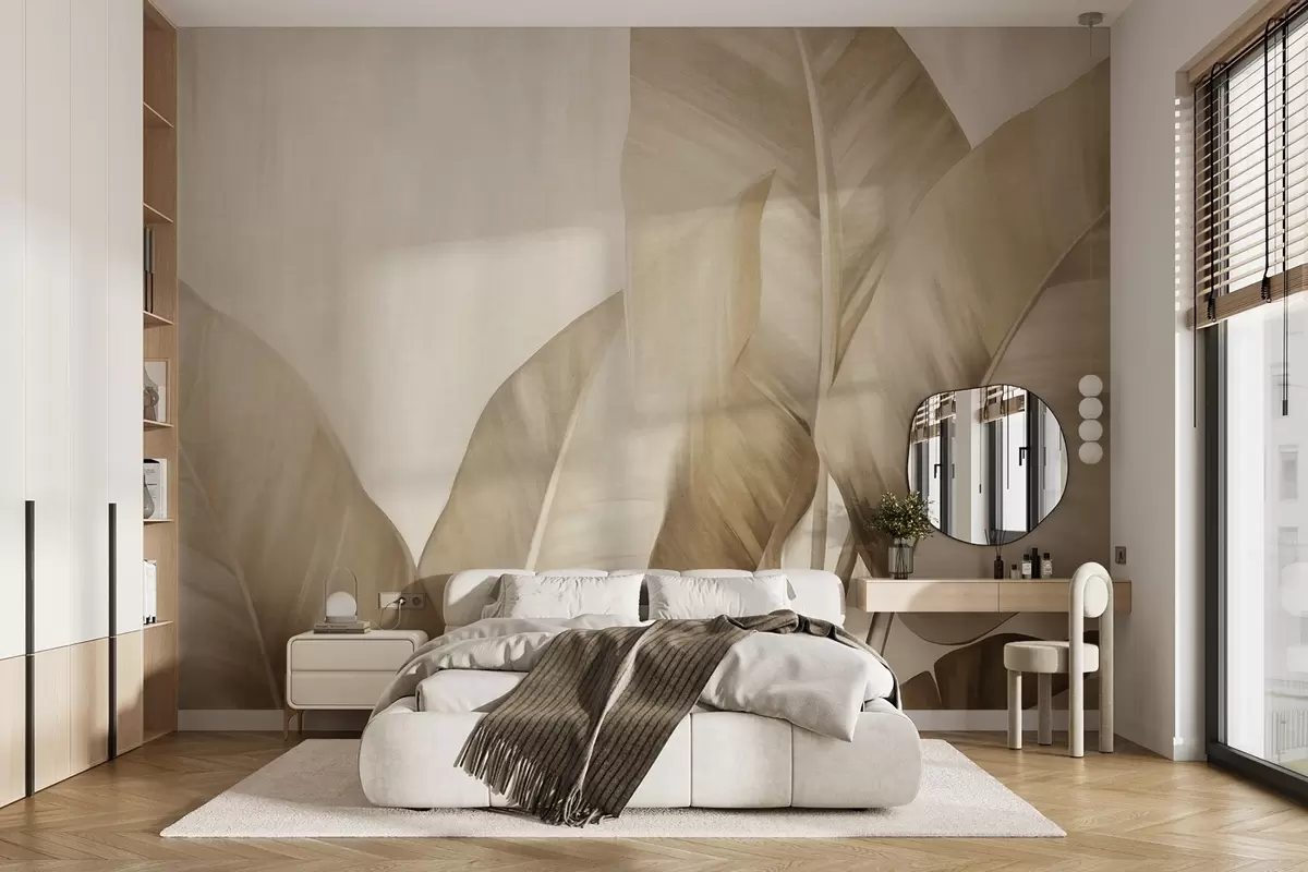 Fototapeedid Tekstuuriga suured, helepruunid banaanilehed helebeeži taustal, pehme ja minimalistliku esteetikaga Nr w09586