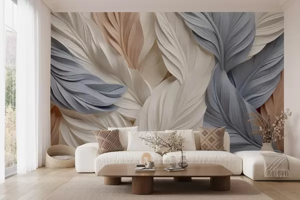 Fototapeedid Abstraktsed, kihilised suled kreemika, beeži ja helesinise tooniga, tekstuurse, orgaanilise välimusega Nr w09603