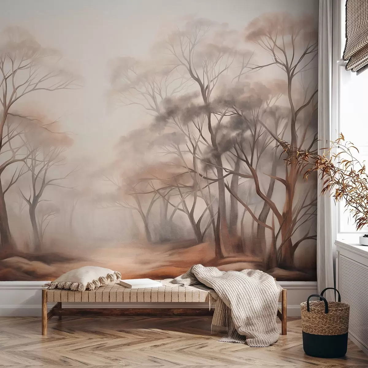 Fototapeedid Tekstuuriga puud uduses metsas, udune maastik vaoshoitud värvide ja pehme valgustusega Nr w09609