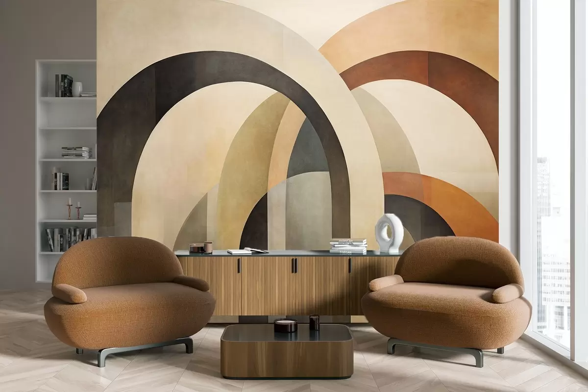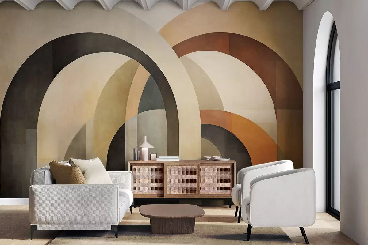Fototapeedid Abstraktsed tekstuuriga geomeetrilised kaared mahedates beežides, pruunides ja hallides toonides, kihiline modernne arhitektuuriline disain Nr w09611