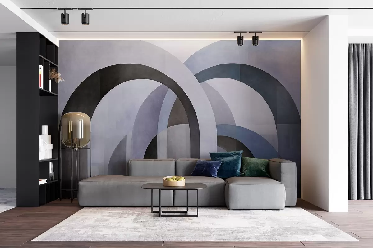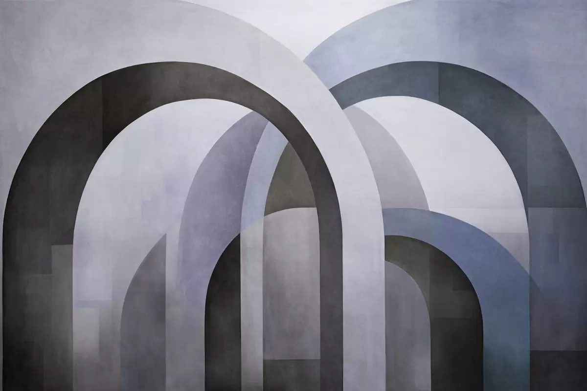 Fototapeedid Abstraktsed tekstuuriga geomeetrilised kaared sinise, musta ja halli toonides, kihiline modernne arhitektuuriline disain Nr w09611v1