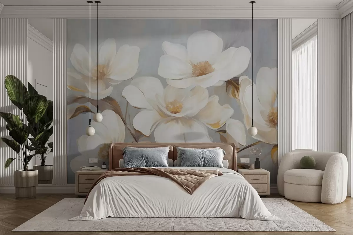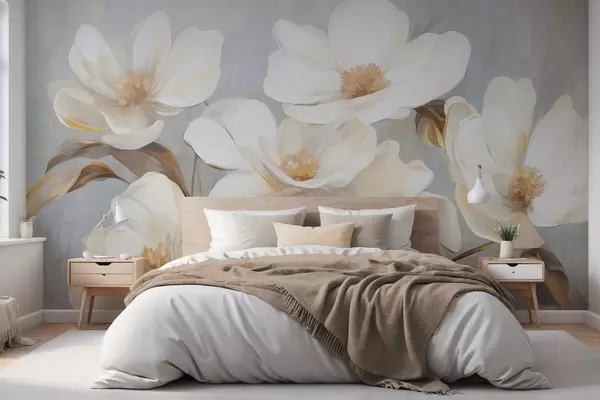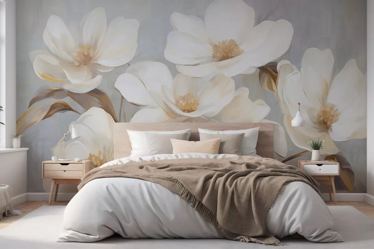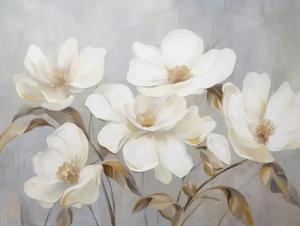 Fototapeedid Tekstuuriga maal, mis imiteerib mitut valget magnoliaõit pastelltoonides taustal. Nr w09612