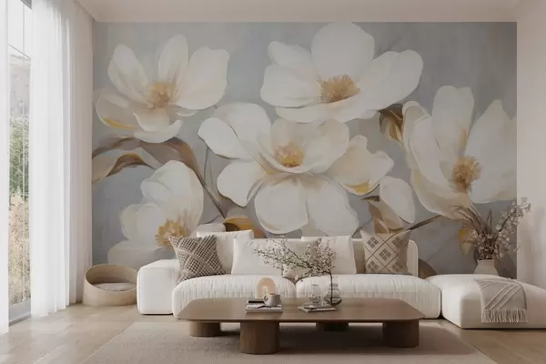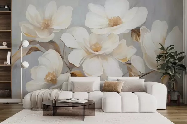 Fototapeedid Tekstuuriga maal, mis imiteerib mitut valget magnoliaõit pastelltoonides taustal. Nr w09612