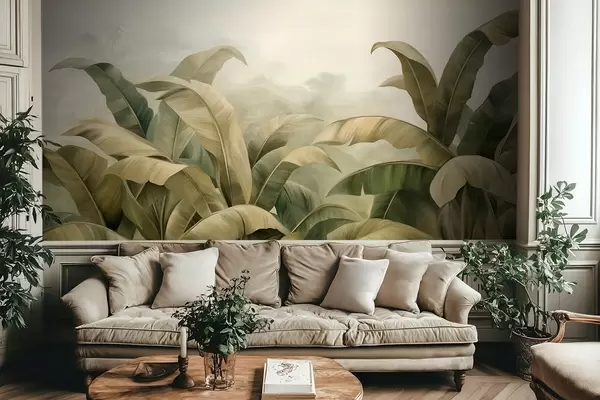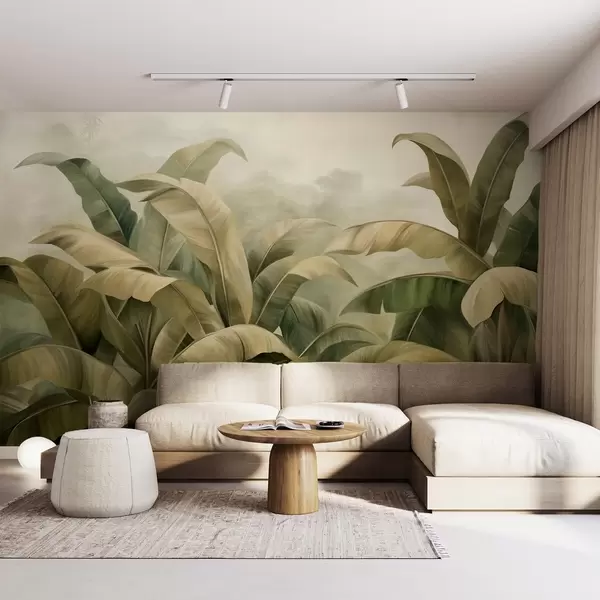 Fototapeedid Tekstuuriga tihe džungelmaastik suurte banaanilehtedega vaoshoitud rohelistes ja beežides toonides Nr w09613