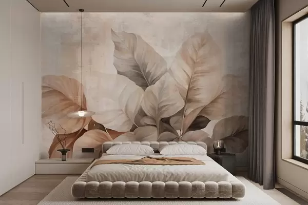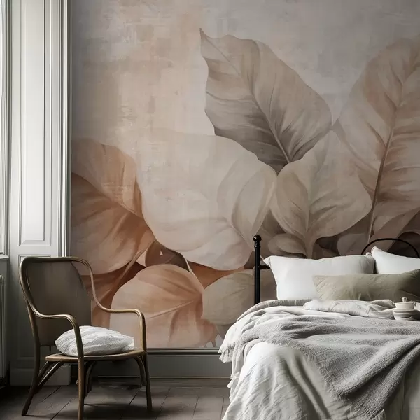 Fototapeedid Tekstuuriga maal, mis imiteerib suuri, helepruune lehti neutraalsel taustal, peenete pintslitõmmetega. Nr w09614