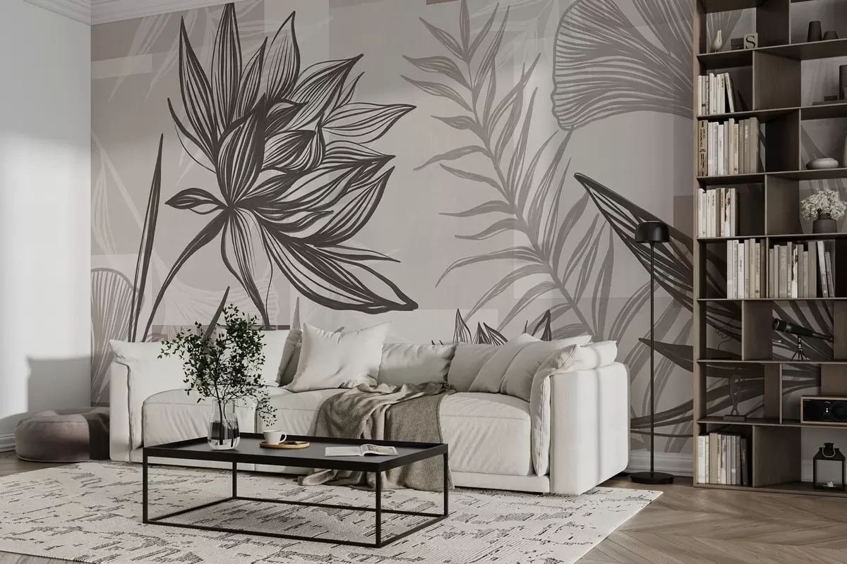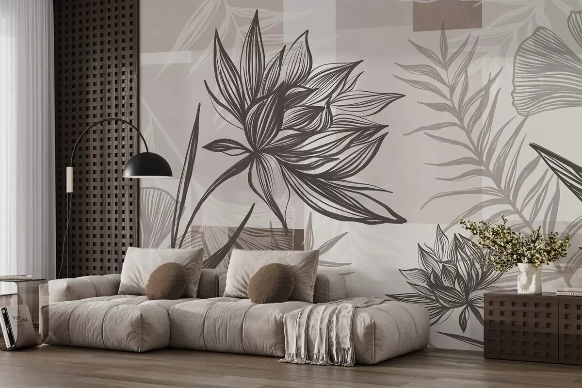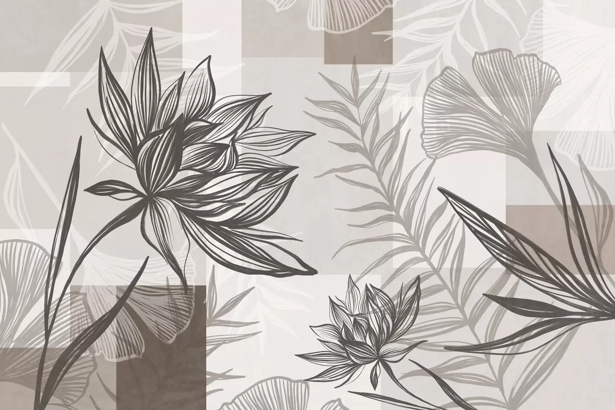 Fototapeedid Tekstuuriga stiliseeritud lilled ja lehed pruuni ja beeži toonides, geomeetrilise taustaga, joonistatud kunst Nr w09629
