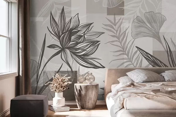 Fototapeedid Tekstuuriga stiliseeritud lilled ja lehed pruuni ja beeži toonides, geomeetrilise taustaga, joonistatud kunst Nr w09629
