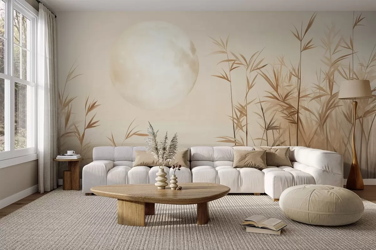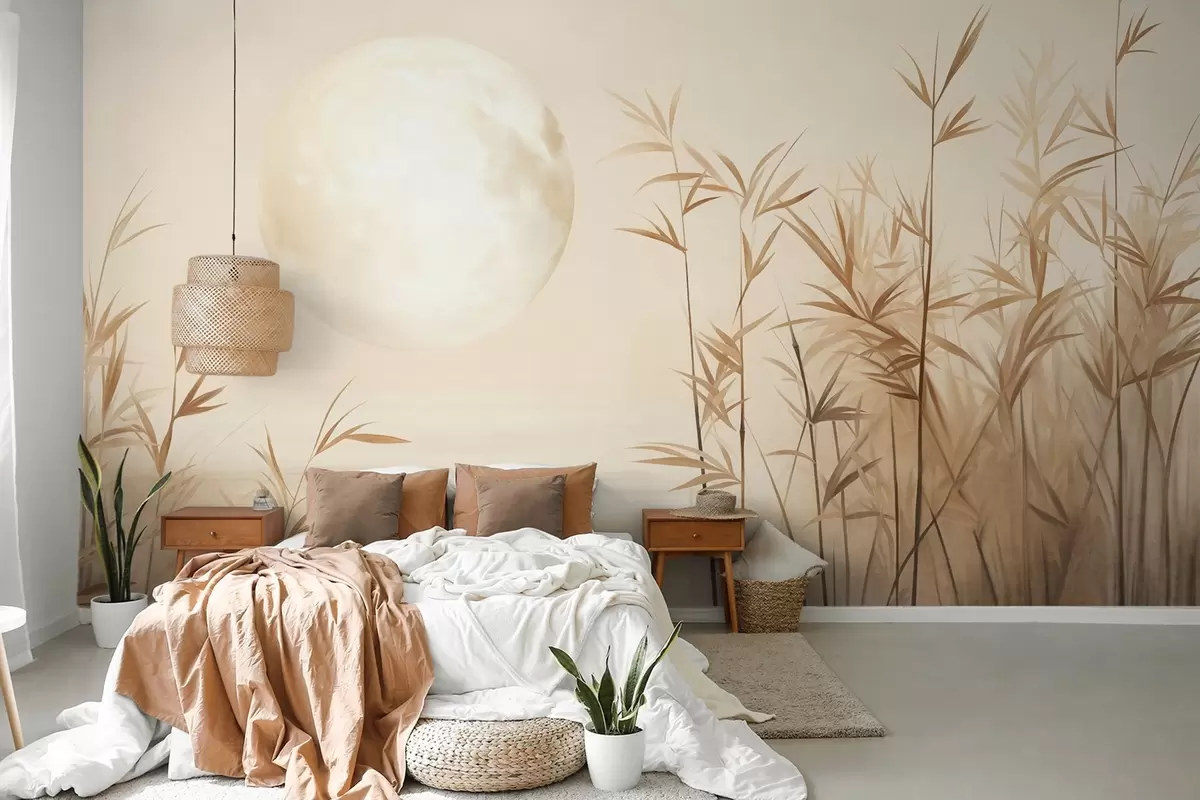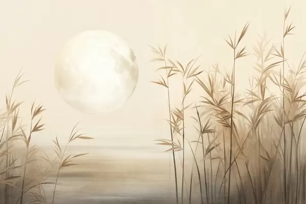 Fototapeedid Tekstuurne maastik kõrge roo, järve ja kahvatu kuuga uduses taevas Nr w09631