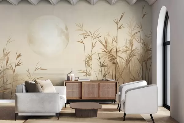 Fototapeedid Tekstuurne maastik kõrge roo, järve ja kahvatu kuuga uduses taevas Nr w09631