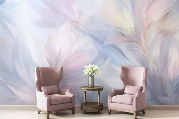 Fototapeedid Pehmed, pastellvärvides lehed ja suled roosa, sinise ja kollase toonides, abstraktne ja tekstuurne trükis Nr w09634