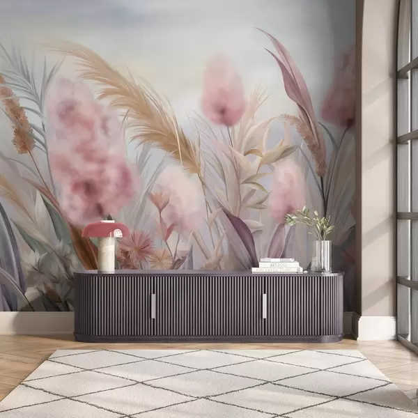 Fototapeedid Roosa ja beež pampasrohi ja muud kuivatatud lilled pehme, uduse taeva taustal Nr w09635