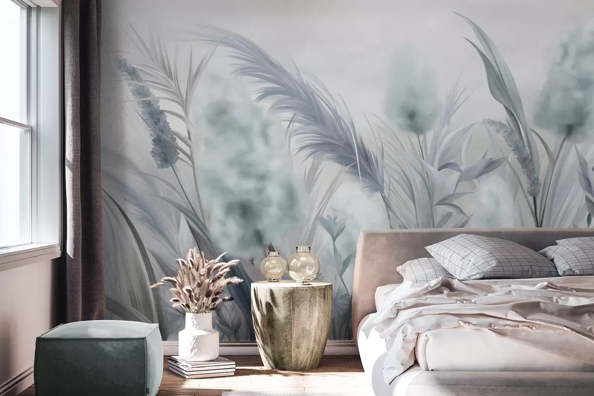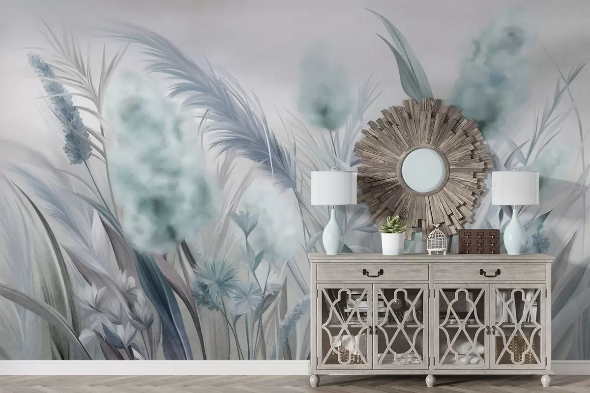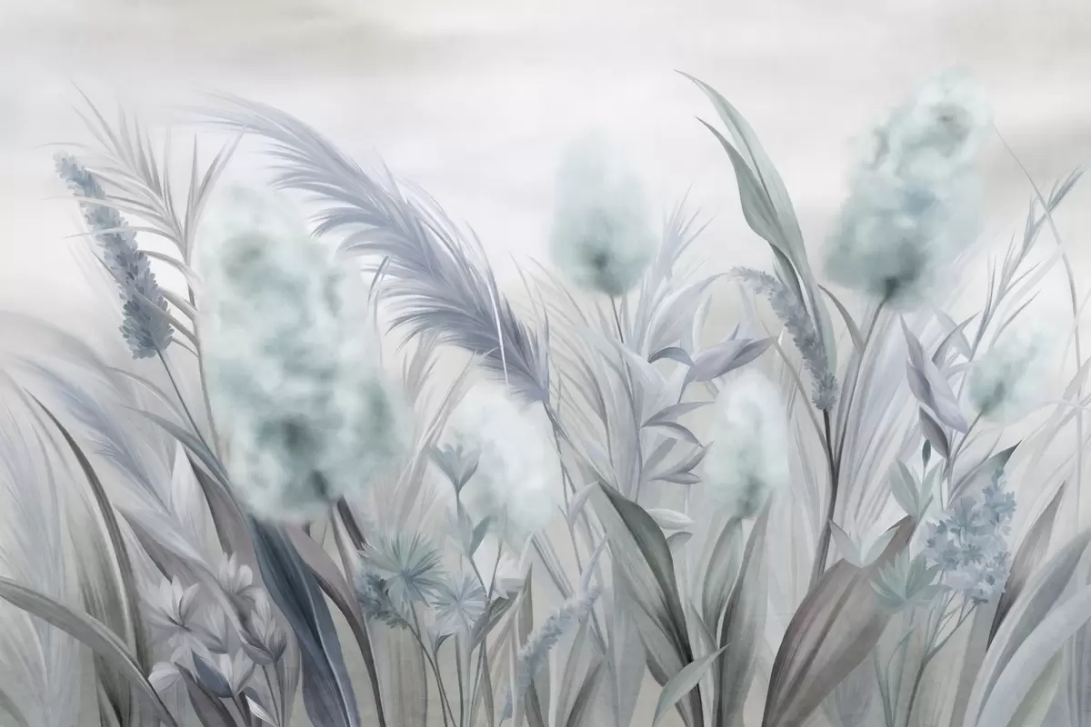 Fototapeedid Sinine ja hall pampasrohi ning muud kuivatatud lilled pehme, uduse taeva taustal Nr w09635v1