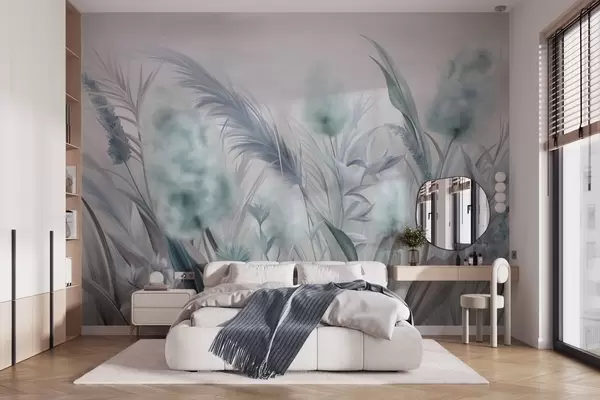 Fototapeedid Sinine ja hall pampasrohi ning muud kuivatatud lilled pehme, uduse taeva taustal Nr w09635v1