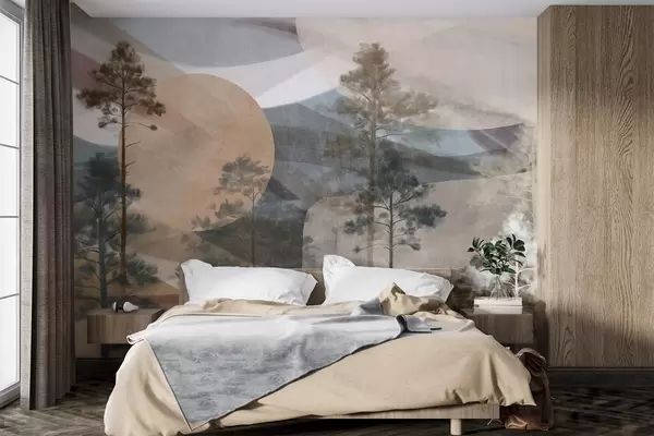 Fototapeedid Kõrged männipuud vaoshoitud tekstuuriga maastikul, millel on abstraktsed ringikujulised vormid ja kihilised mäed maatoonides. Nr w09636