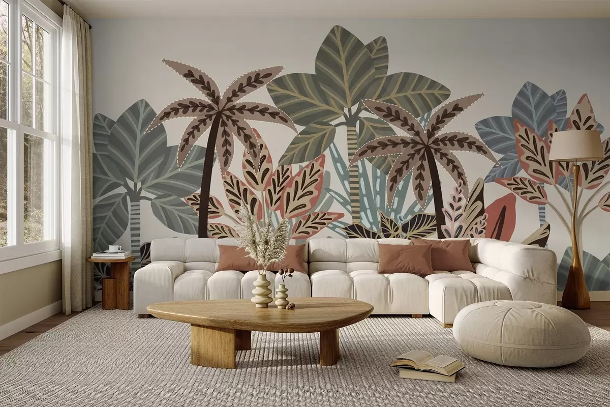 Fototapeedid Tekstuuriga troopilised taimed ja palmipuud vaoshoitud värvidega dekoratiivses boho-stiilis kreemika taustal Nr w09639