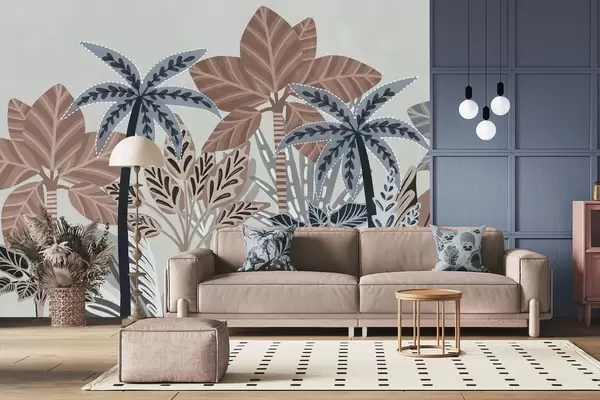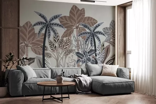Fototapeedid Tekstuuriga troopilised taimed ja palmipuud vaoshoitud värvidega dekoratiivses boho stiilis halli taustal Nr w09639v1