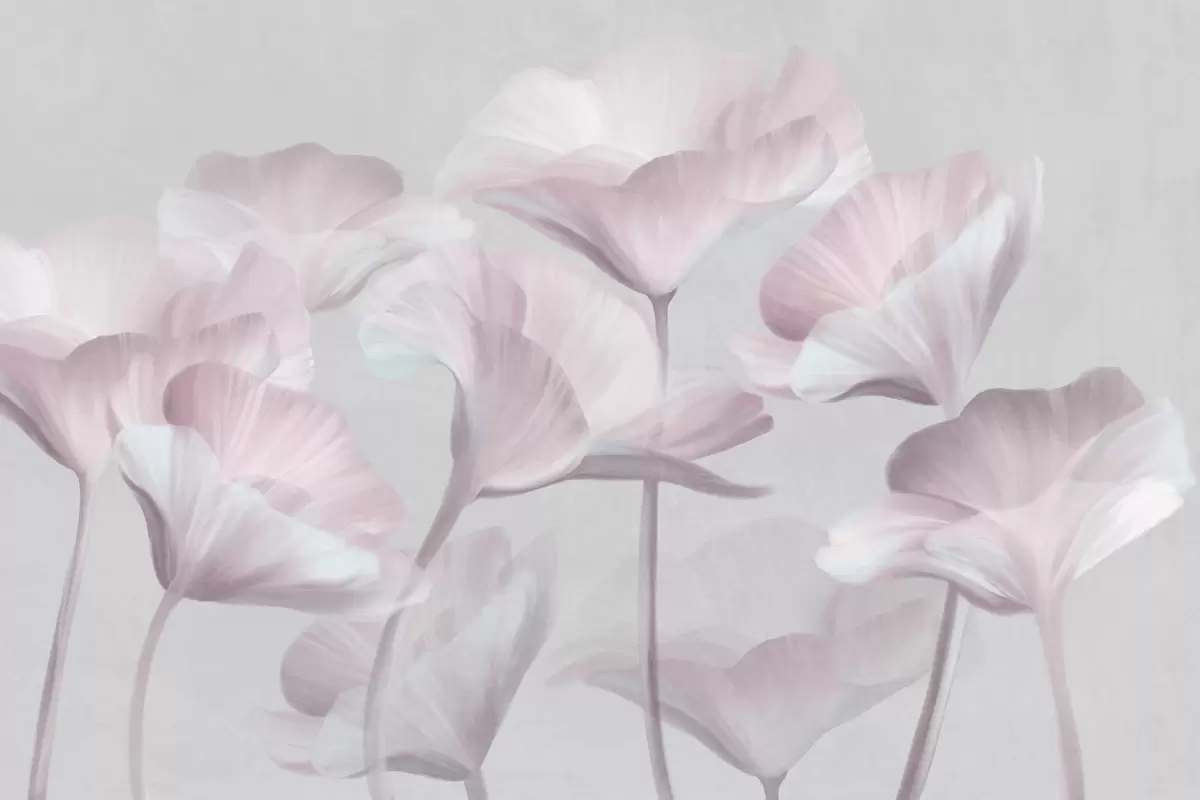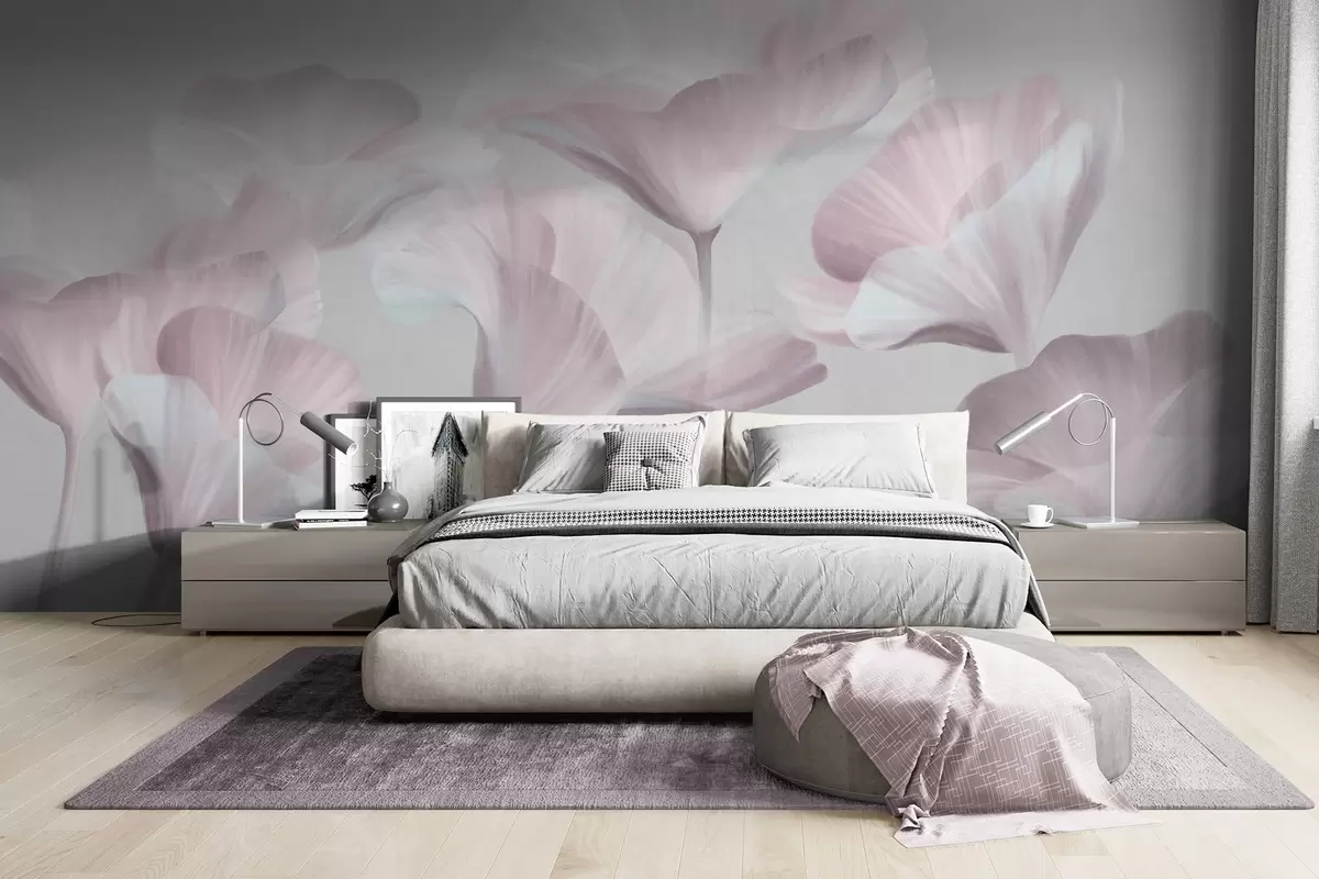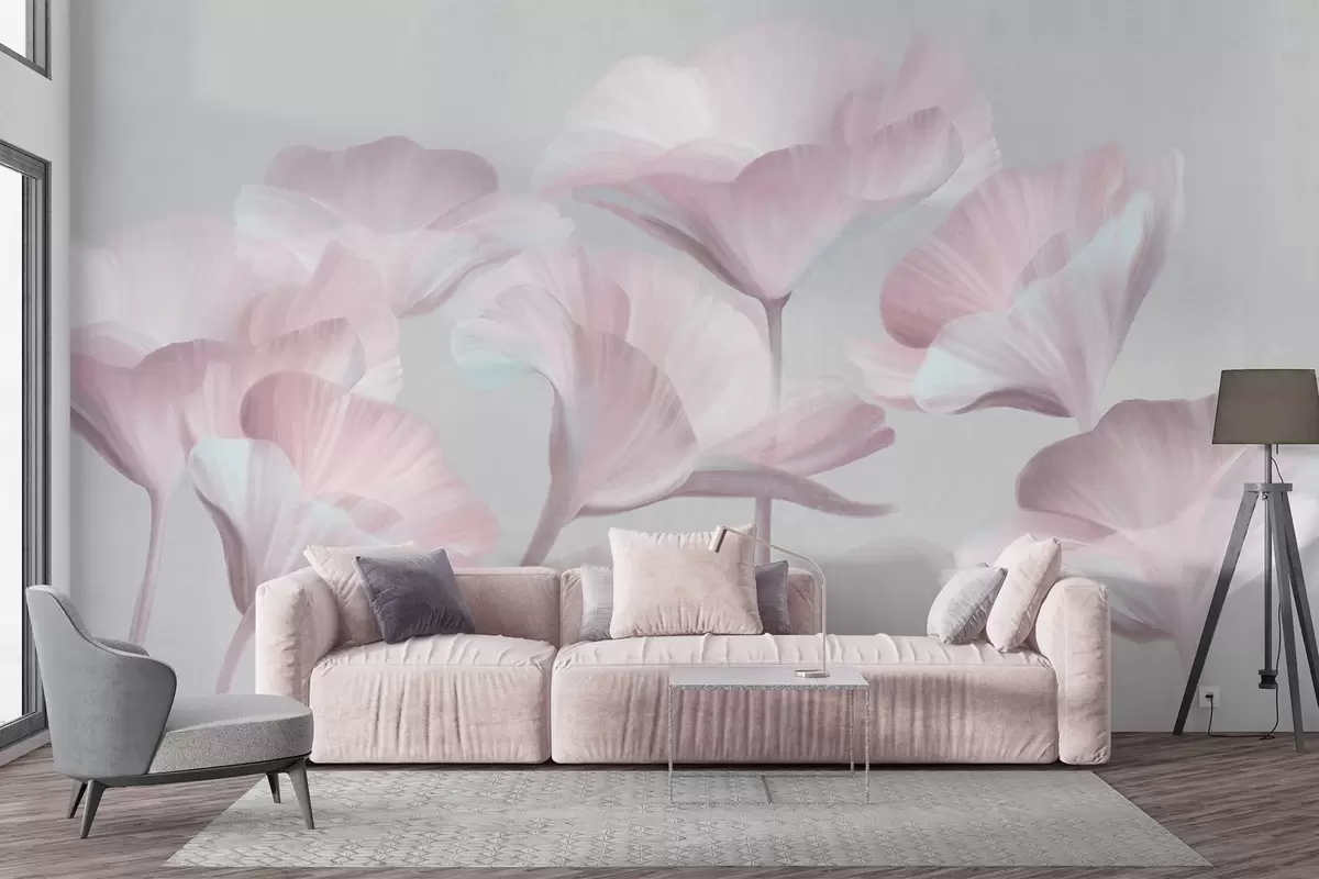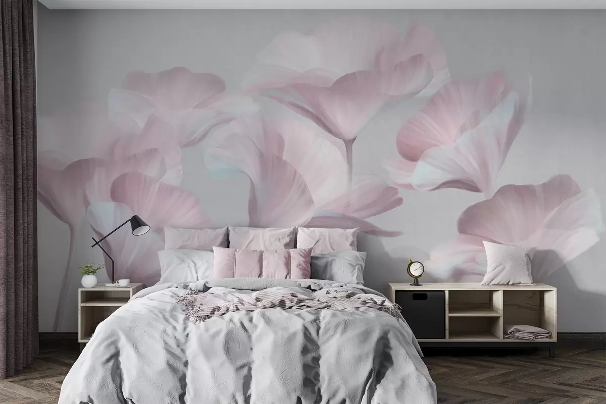 Fototapeedid Hele roosa tekstuuriga läbipaistvad lootoseõied õrnad õielehed vaoshoitud halli taustaga Nr w09640v1