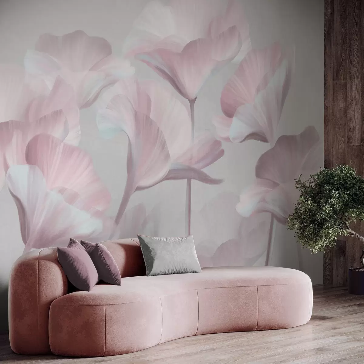 Fototapeedid Hele roosa tekstuuriga läbipaistvad lootoseõied õrnad õielehed vaoshoitud halli taustaga Nr w09640v1