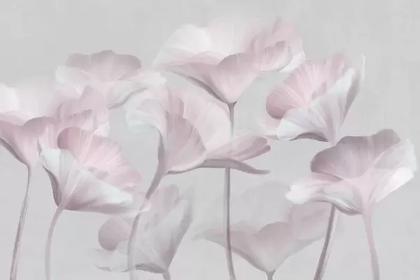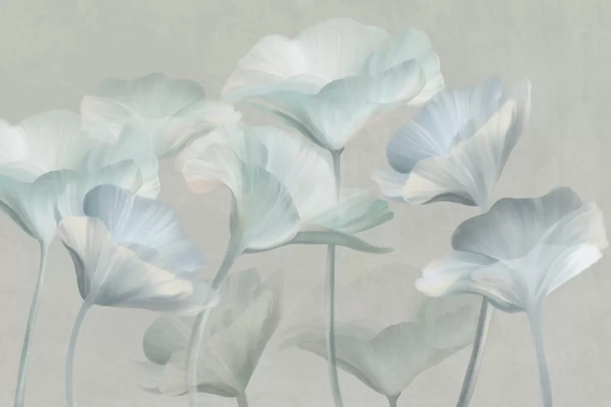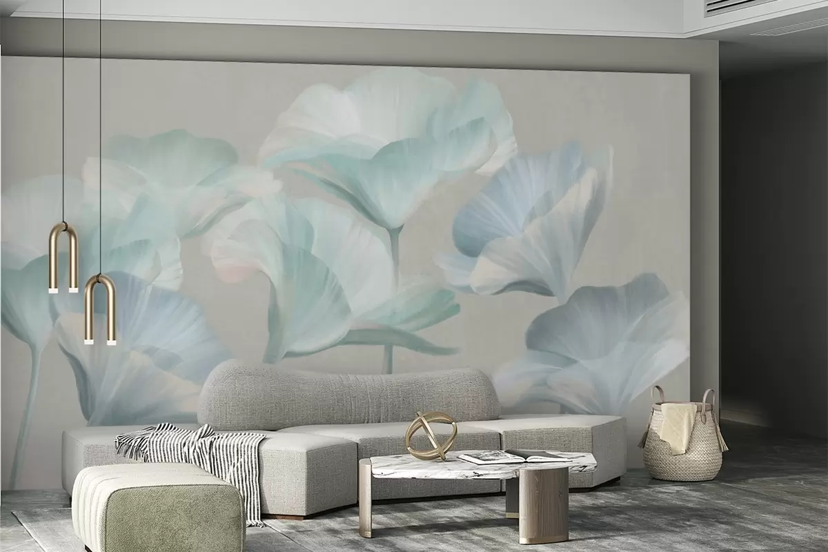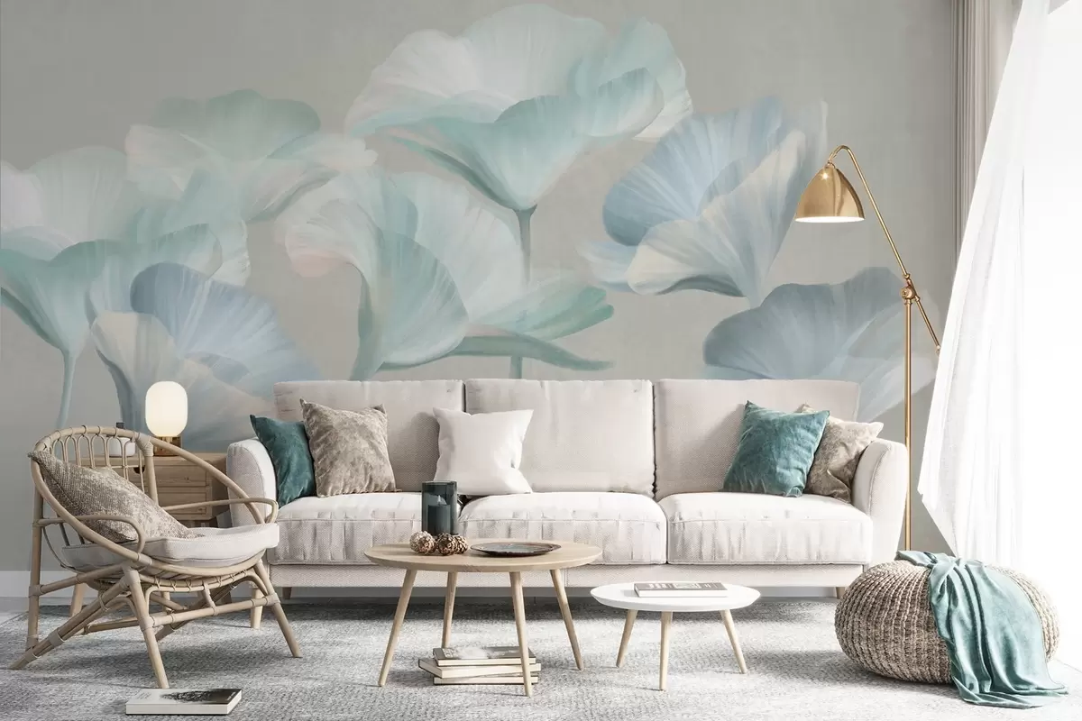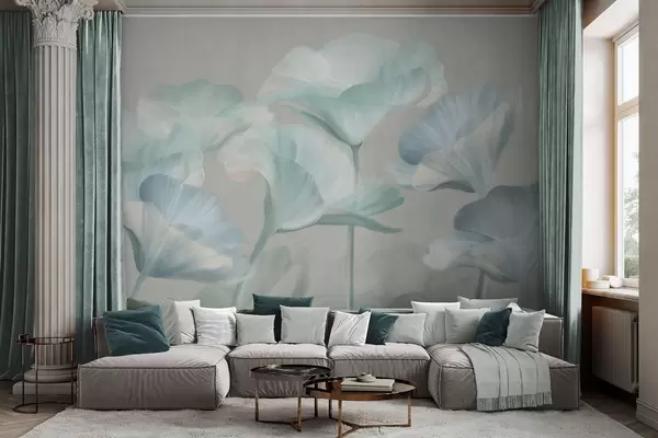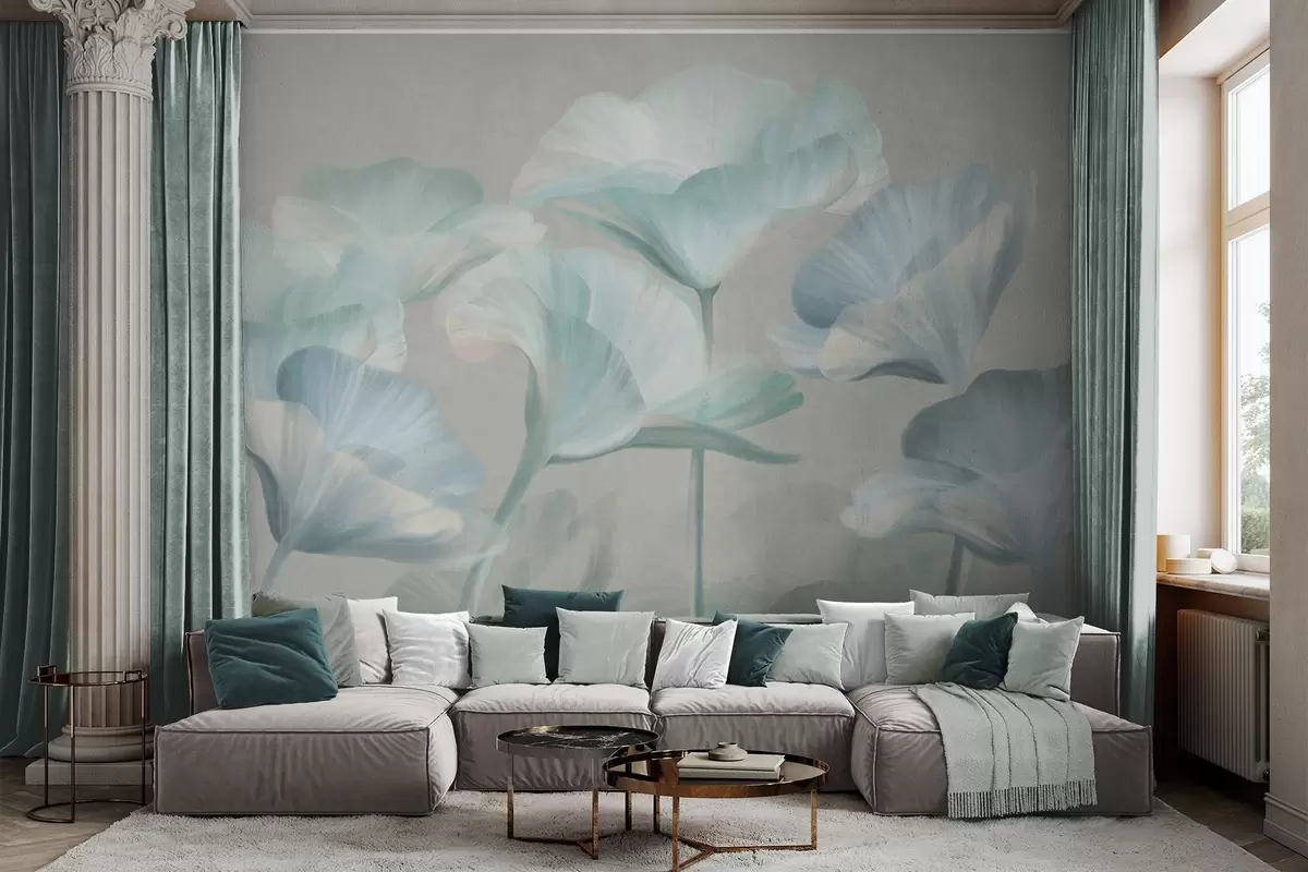 Fototapeedid Hele türkiissinine tekstuuriga läbipaistvad lootoseõied õrnad õielehed halli taustal Nr w09640v2