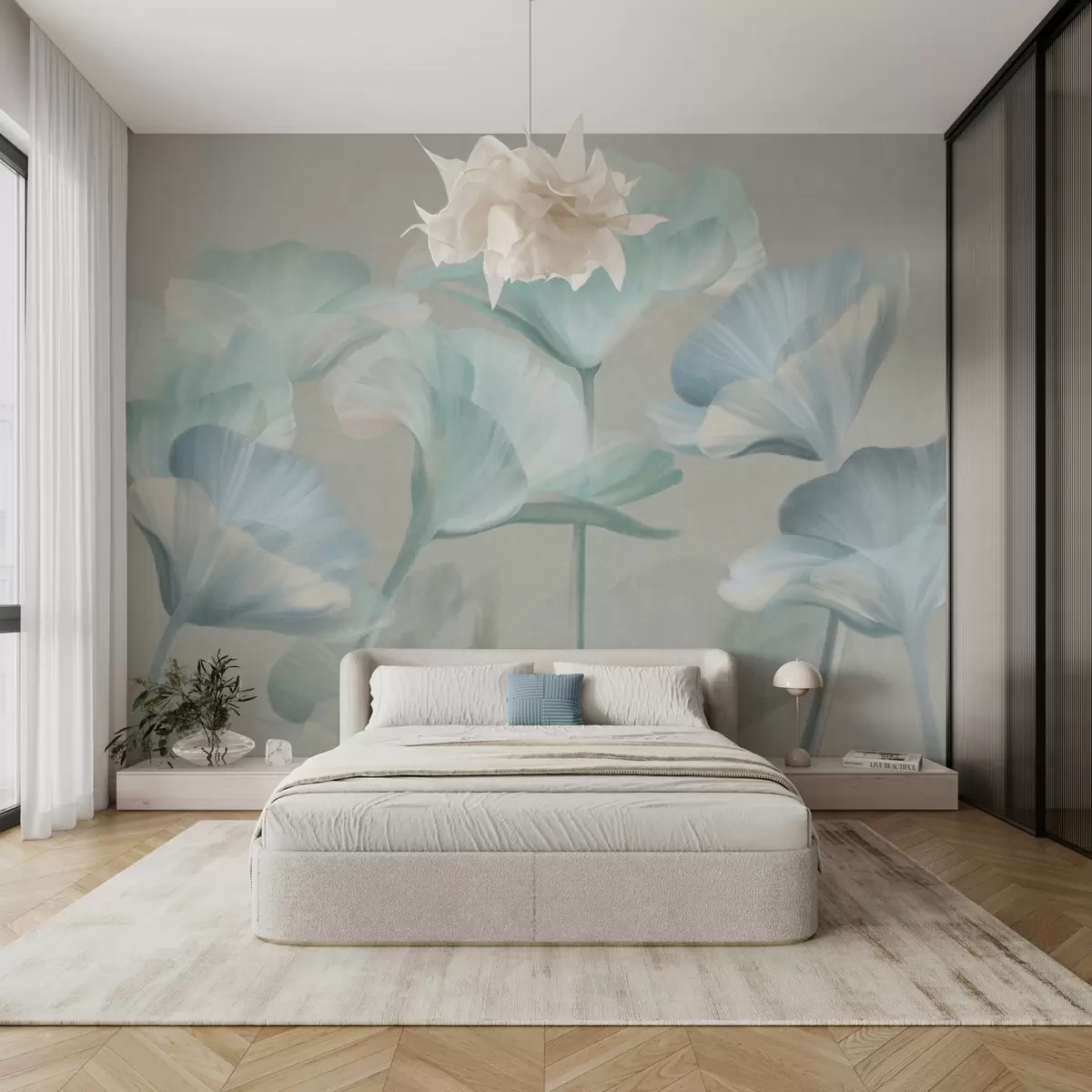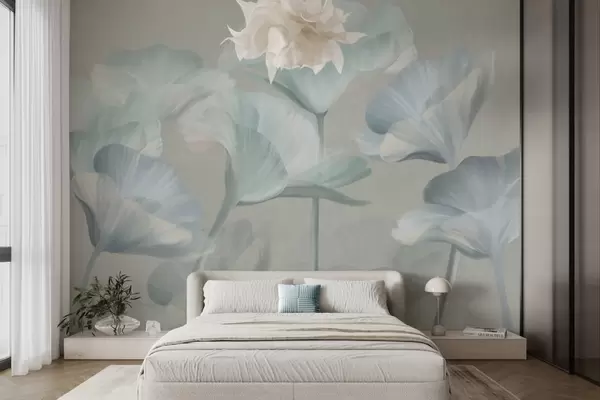 Fototapeedid Hele türkiissinine tekstuuriga läbipaistvad lootoseõied õrnad õielehed halli taustal Nr w09640v2