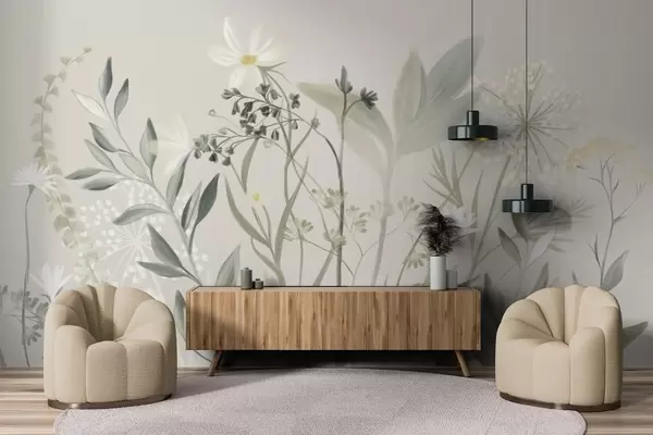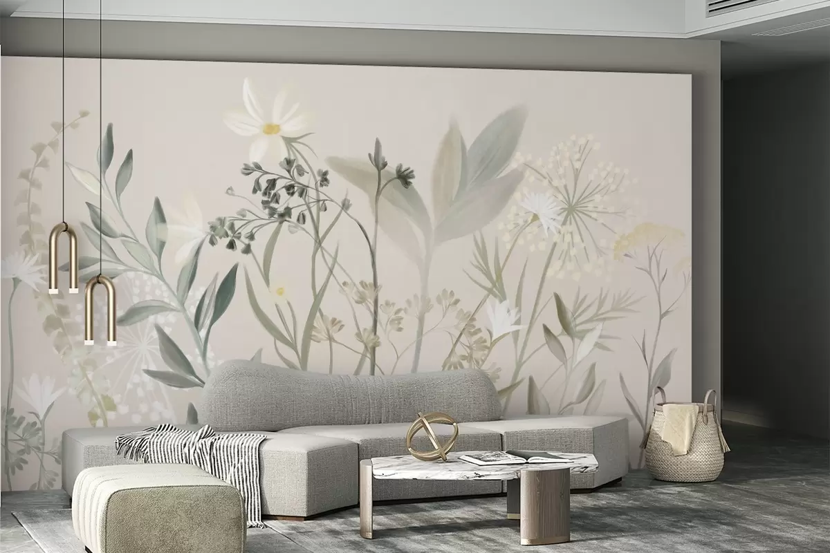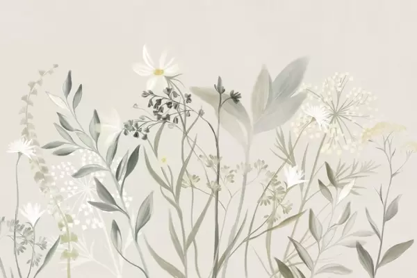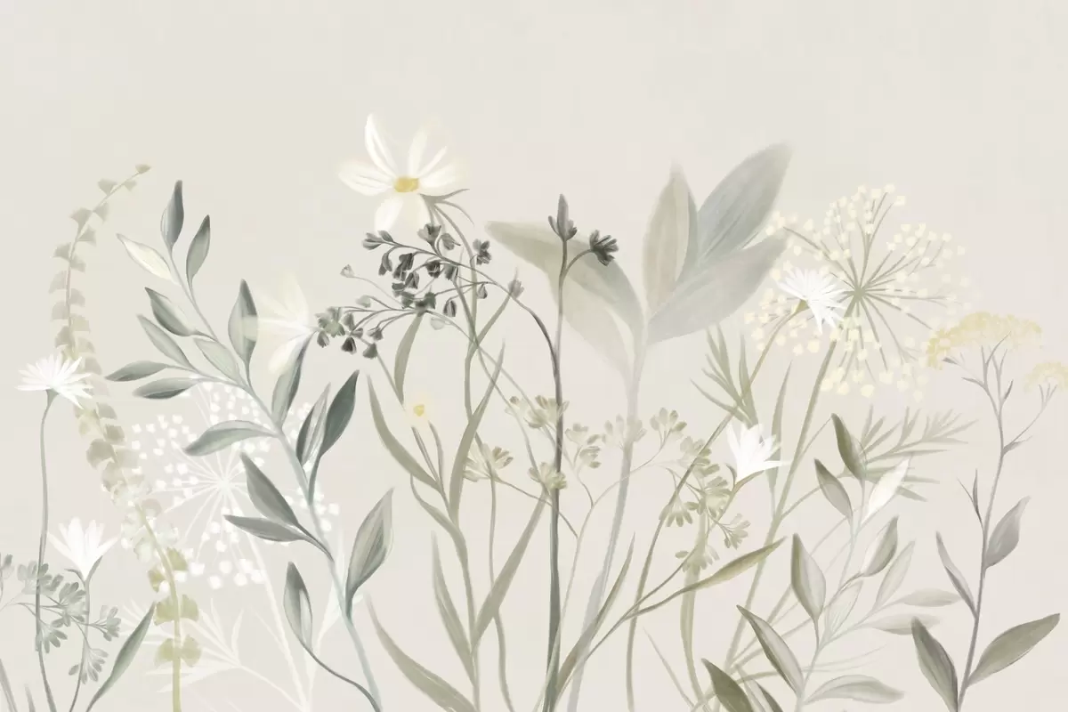 Fototapeedid Õrnad tekstuuriga looduslilled ja lehed vaoshoitud rohelistes ja kreemikates toonides pehme beeži taustal Nr w09641