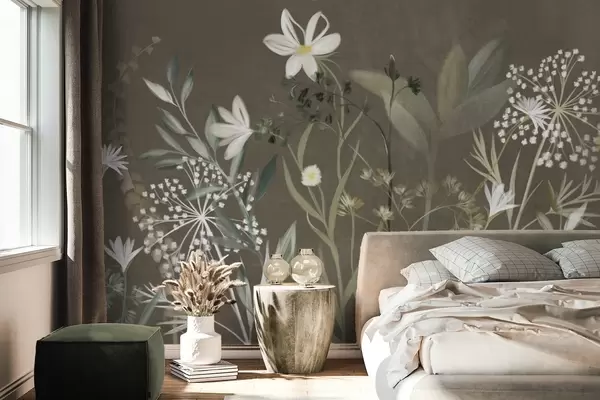 Fototapeedid Õrnad tekstuuriga looduslilled ja lehed vaoshoitud rohelistes ja kreemikates toonides pruuni taustal Nr w09641v1
