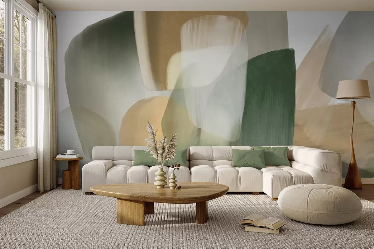 Fototapeedid Abstraktsed tekstuuriga kujundid vaoshoitud rohelistes ja beežides toonides, pehmetes servades ja üksteisega kattuvate kihtidega. Nr w09642