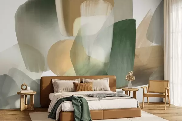 Fototapeedid Abstraktsed tekstuuriga kujundid vaoshoitud rohelistes ja beežides toonides, pehmetes servades ja üksteisega kattuvate kihtidega. Nr w09642